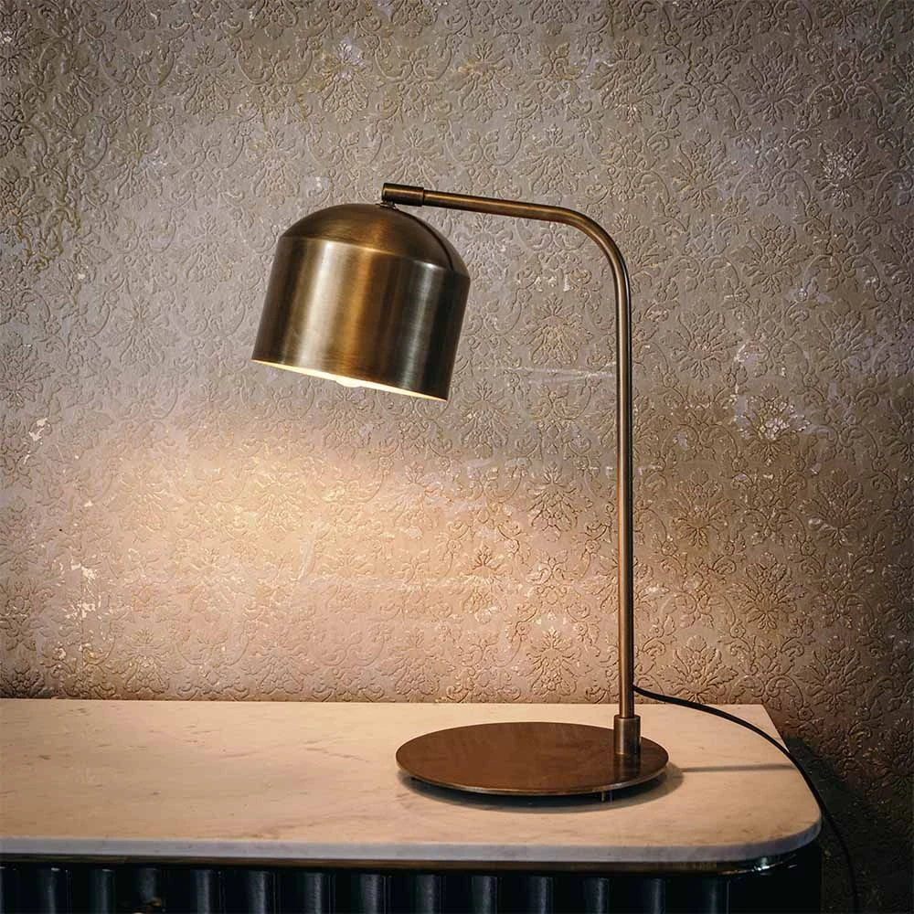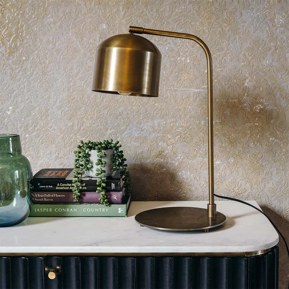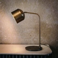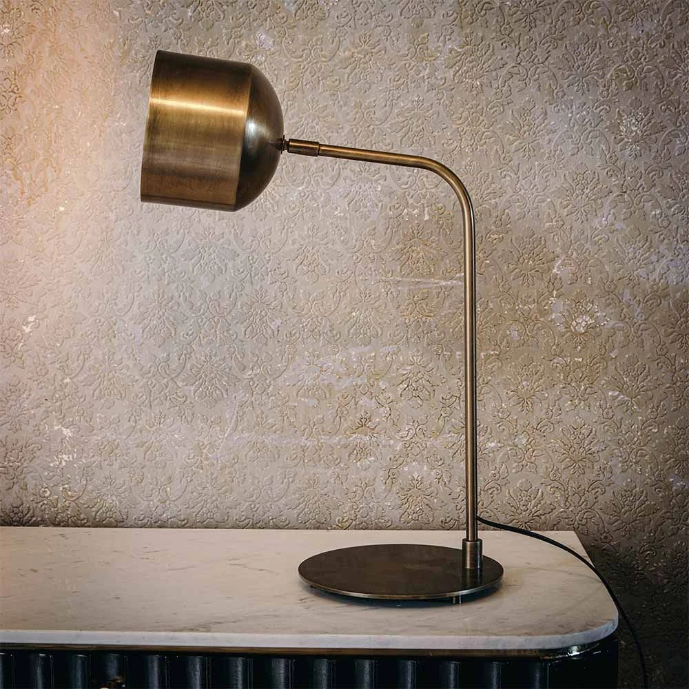 Its form and shape make it the perfect desk lamp for anyone studying or working from home, as its domed brass lamp shade has a tilt feature supported by a slim brass stem. This creates an angled task light that will illuminate study, working or reading for pleasure. It’s also an ideal lounge table lamp and can be used to create cosy corners when placed on a side table, sideboard, console, open shelving or within a bookcase.