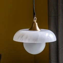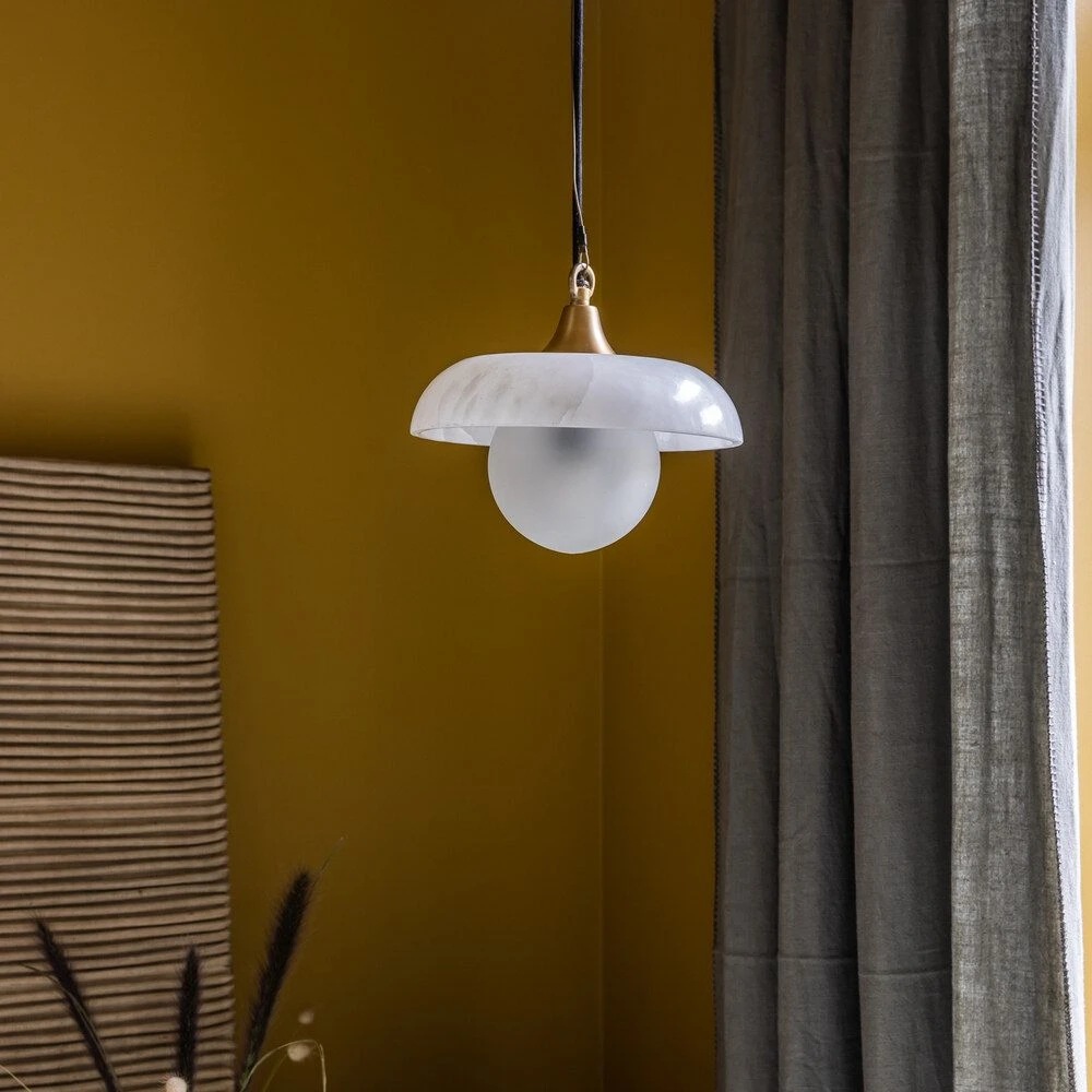 This gorgeous overhead pendant is hand crafted from natural alabaster with a frosted glass dome to soften the light bulb, and finished with a neat brass detail to the top.