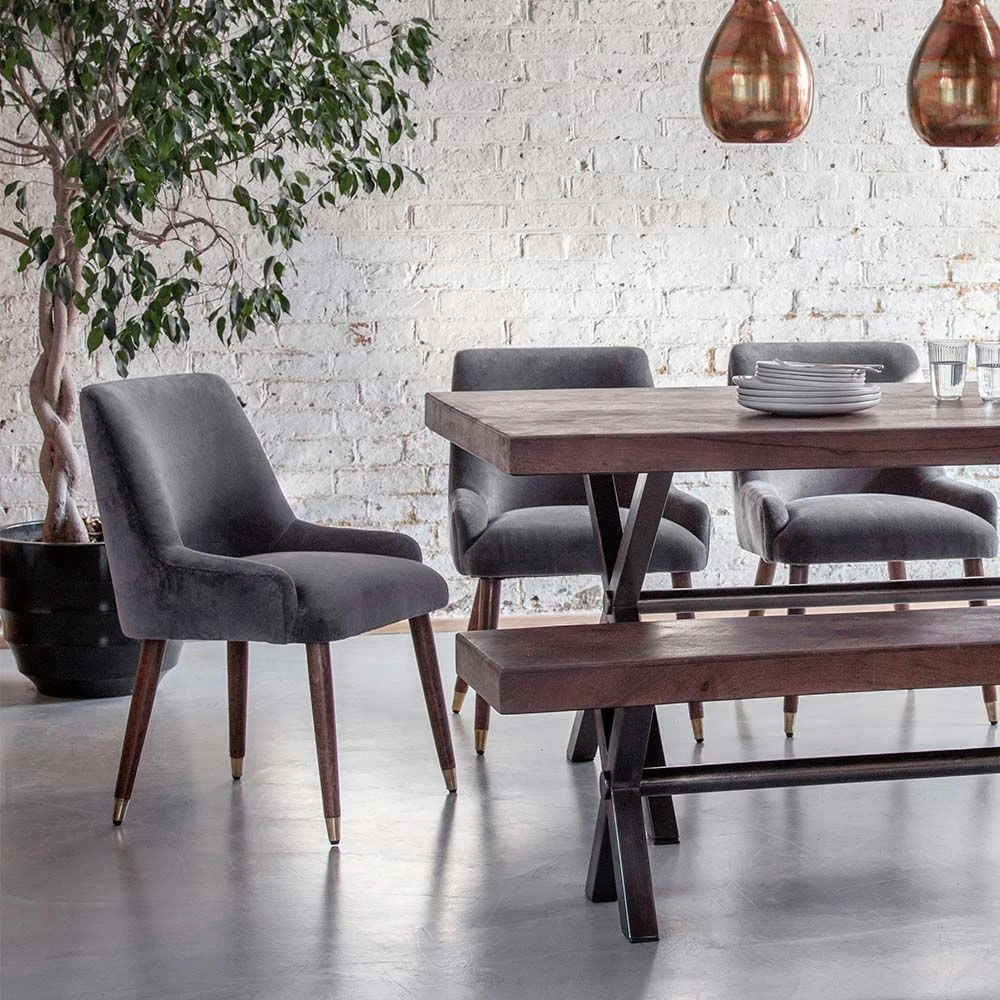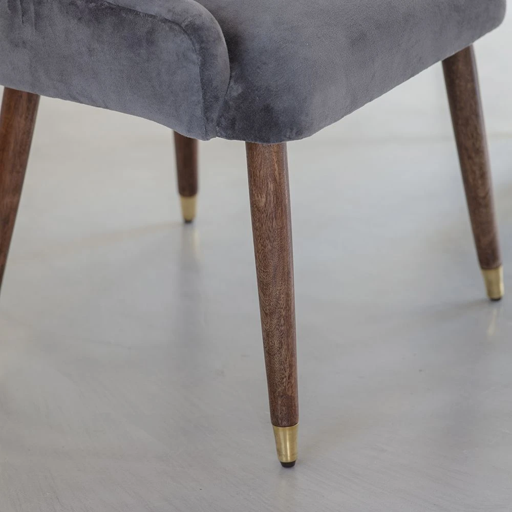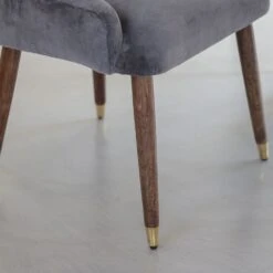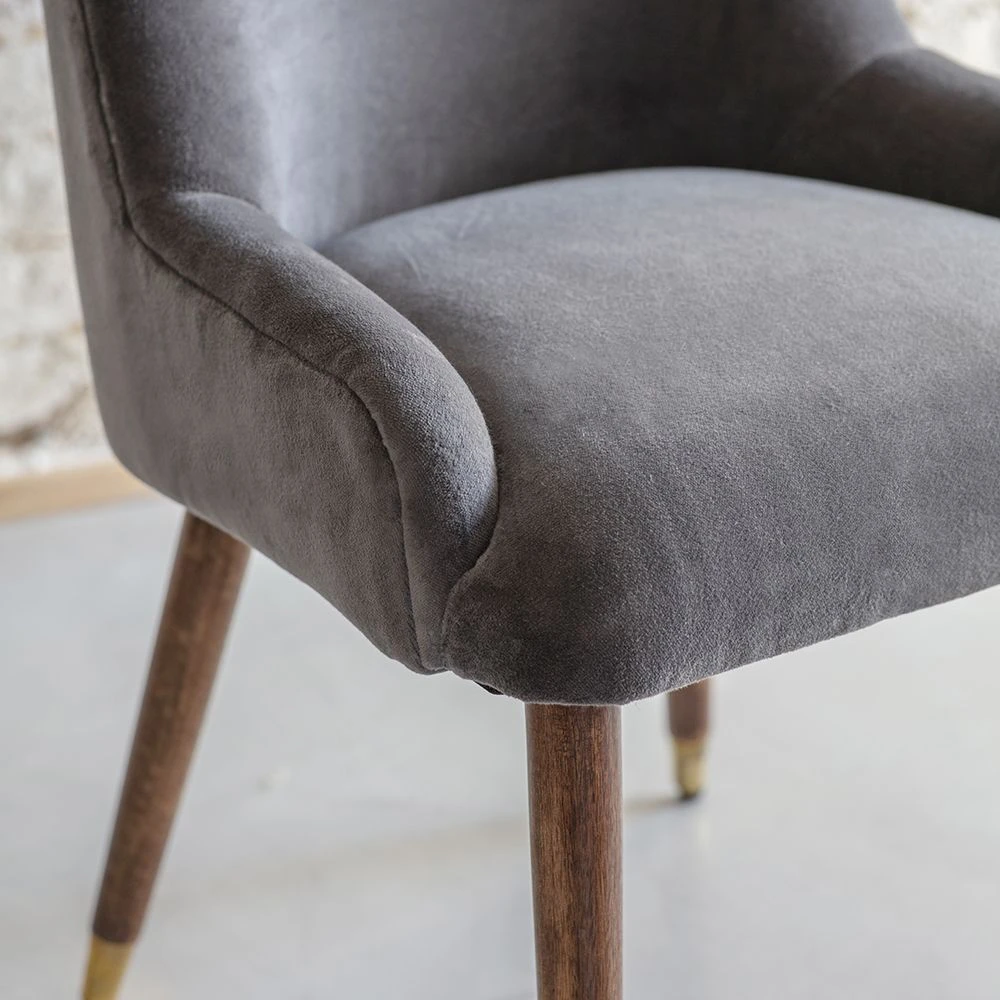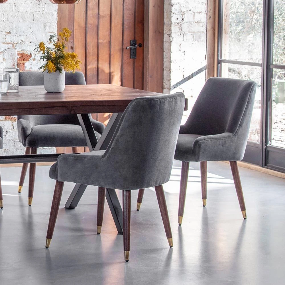 Taking its inspiration from mid-century style, this grey velvet dining chair has a generously sized seat pad and full back rest for excellent back support while feet gliders protect floors from scuffs and marks.