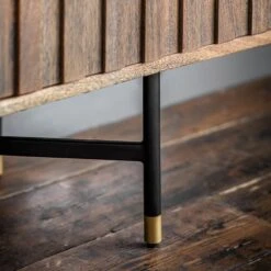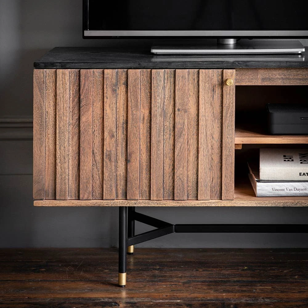 Providing the perfect storage solution for living rooms, dining areas and open-plan spaces, our Berkeley Marble Media Unit has plenty of room for the TV, music systems, games consoles and all the paraphernalia that comes with them. Made from acacia wood, powder coated black iron legs with brass detail and black marble top, itβs part of a complete collection.