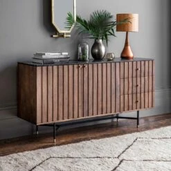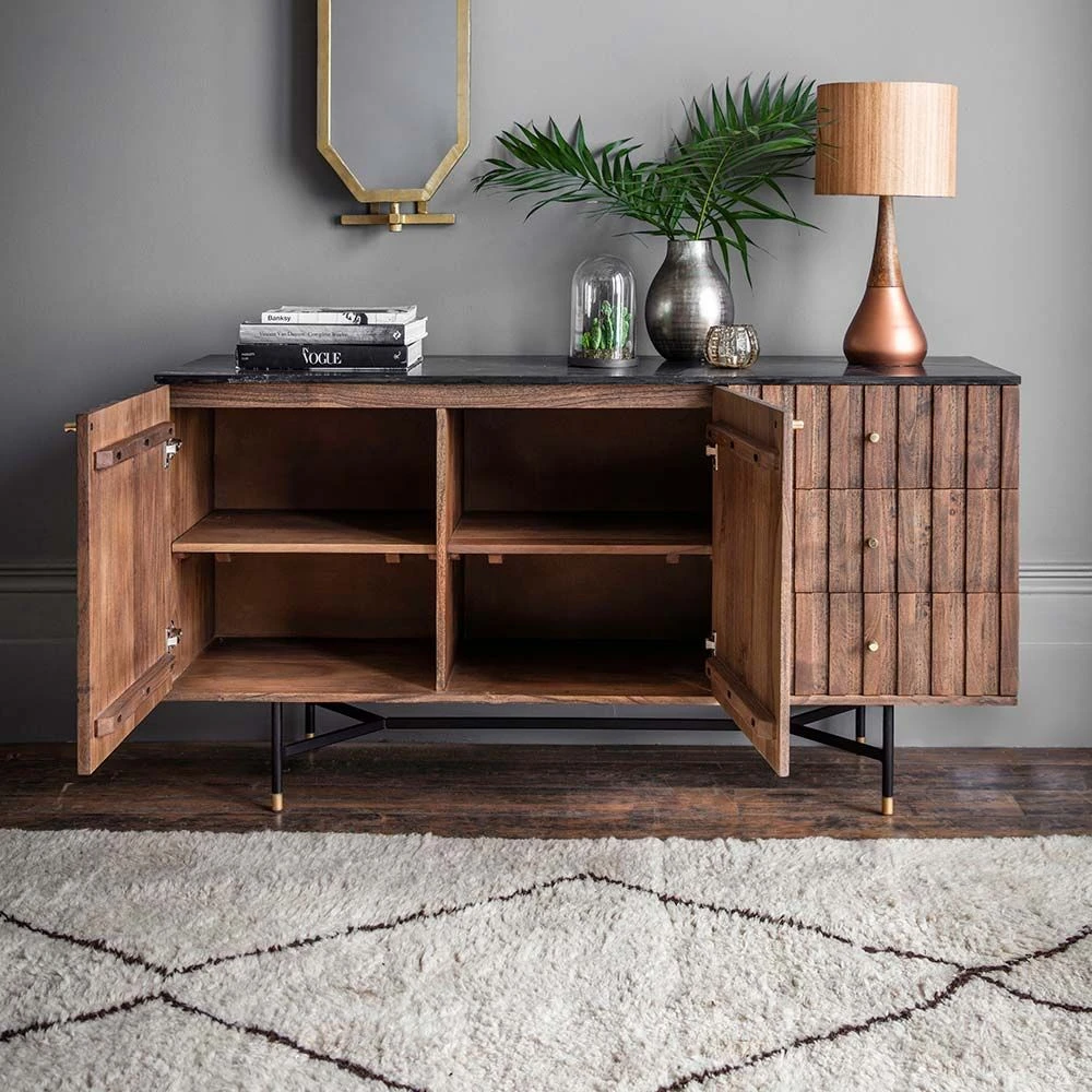 A staple of Seventies interiors, the humble sideboard has come back into fashion big time. Our Berkeley Marble Sideboard has a sleek design that suits both classic and contemporary homes with plenty of closed-door storage for everything you need for the living area, dining room or open-plan space. Made from acacia wood, powder coated black iron legs with brass detail and black marble top.