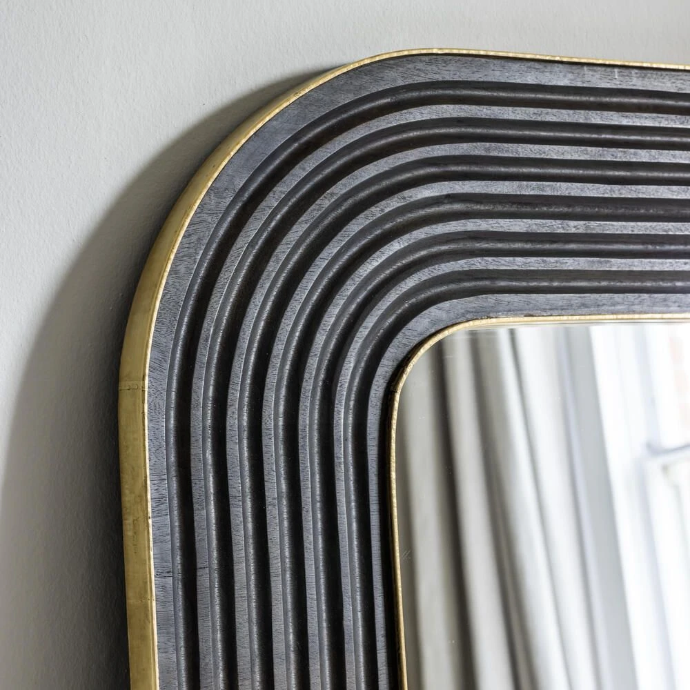 Our Bilbao Carved Wooden Mirror is a statement square mirror with curved design detail in stained wood with a brass metal finish.
