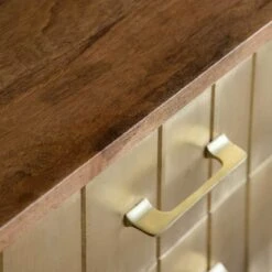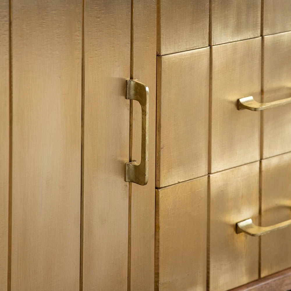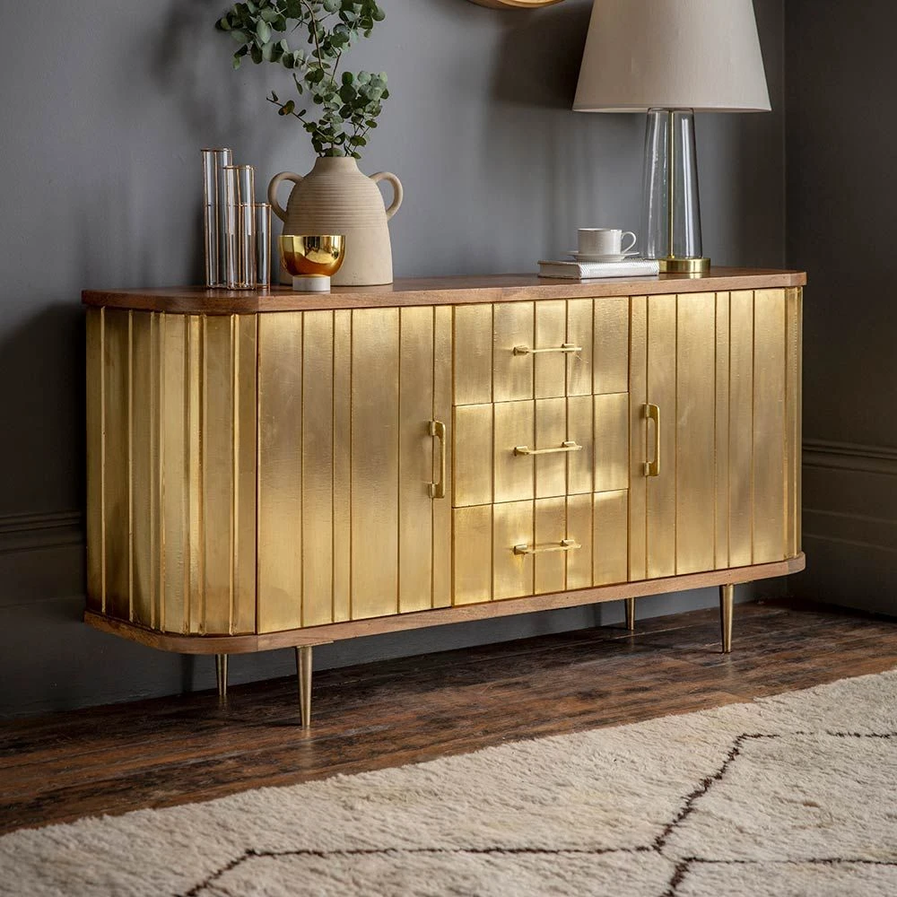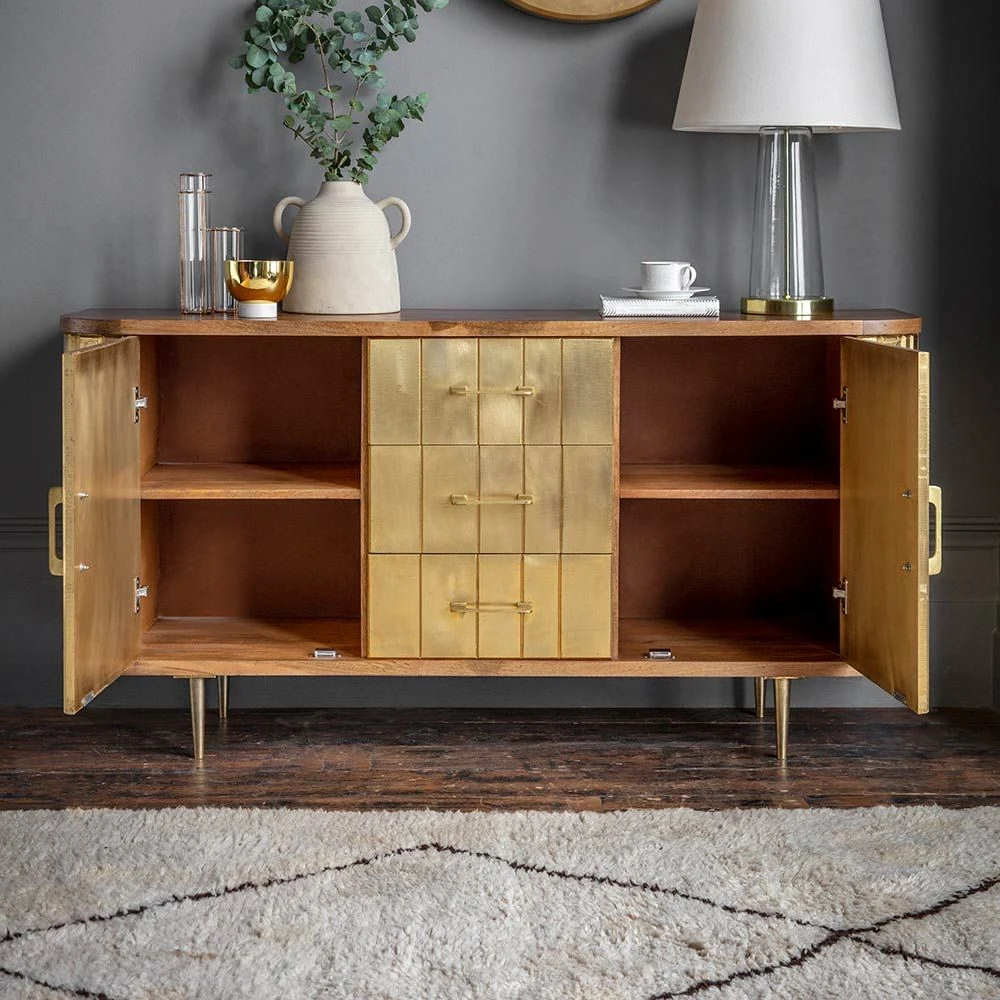 The staple of Seventies interiors is back, as sideboards are one of the must-haves for a hardworking home. Our Broadway Sideboard comes in a natural mango wood and brass clad finish and provides plenty of storage for books, games, DVDs, CDs, vinyl as well as crockery and cutlery in the dining area or even paperwork for home office work.