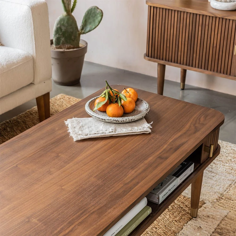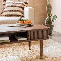 For discreet storage for TV remotes and more, there are two tambour slatted doors that smoothly slide open to reveal practical storage space inside.