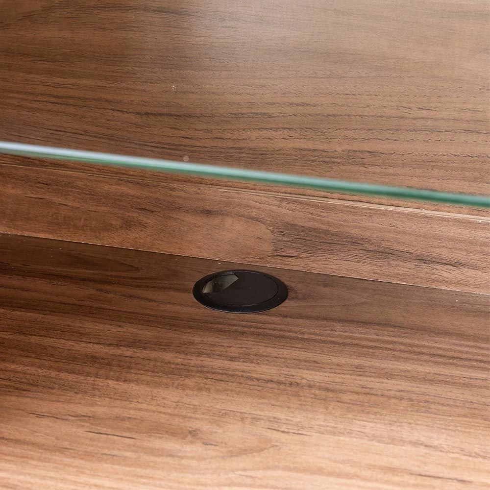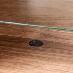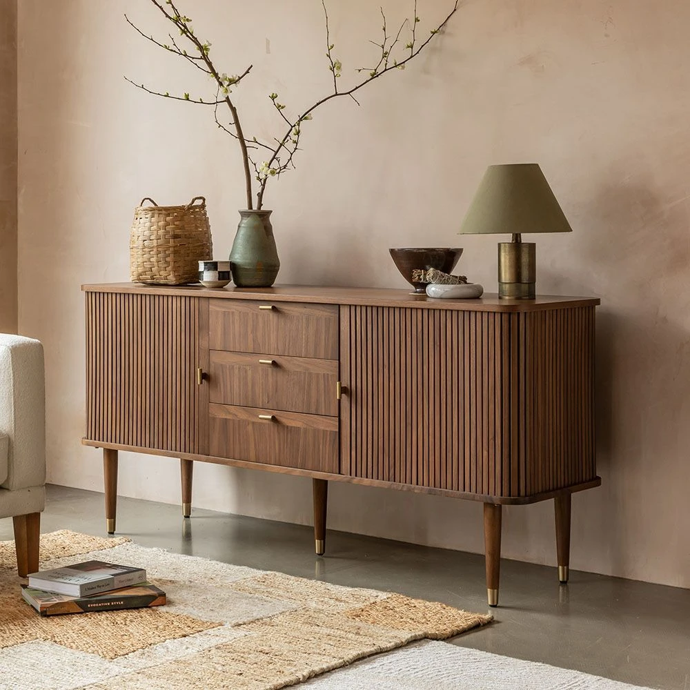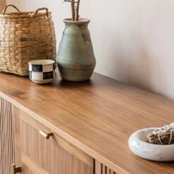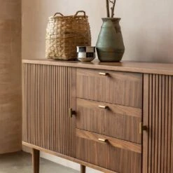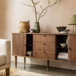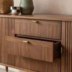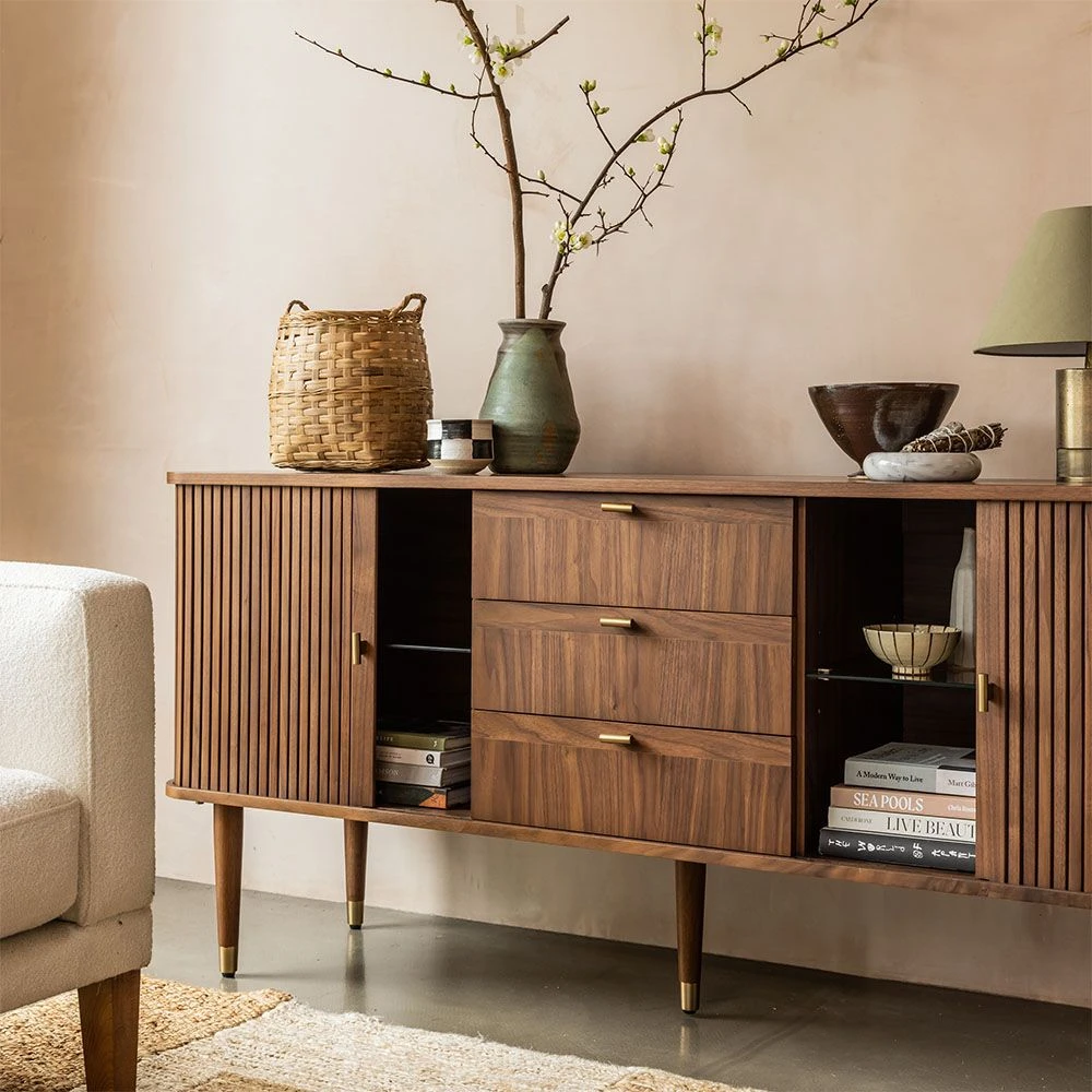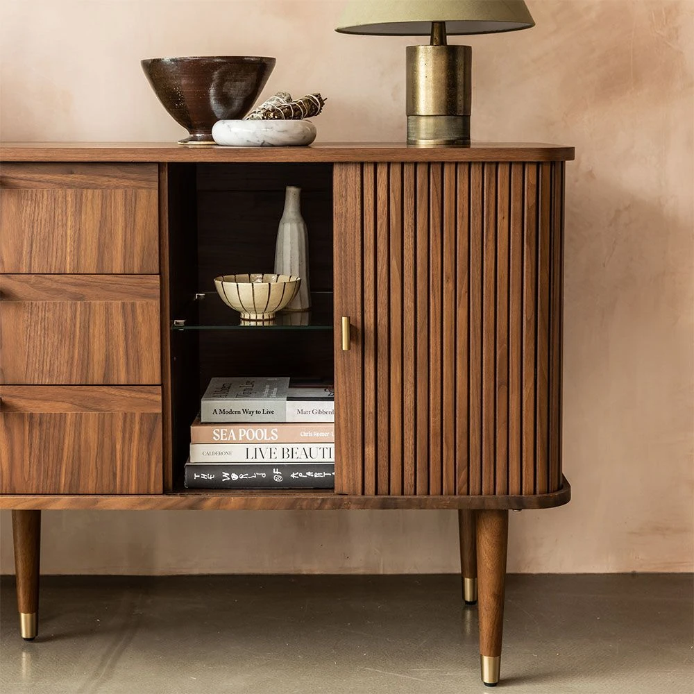 Its warm walnut finish brings a timeless vintage look to your home, with two tambour slatted doors that slide open smoothly to the side, revealing adjustable glass shelving within.