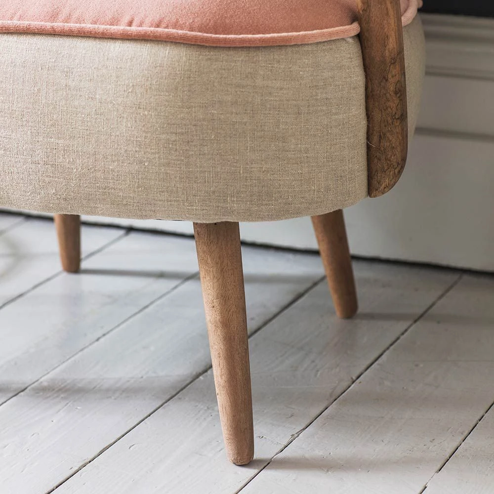 Sit back and relax in the ergonomic comfort of our Calvin chair in champagne pink velvet and linen. This mid-century style design is the ultimate occasional chair, perfect for a cosy reading corner in the living area or bedroom. The champagne velvet offers both comfort and style, with a matching button back and contrasting natural linen base. The sleek wooden handles have an elegant sweeping curve design while the contoured legs are both sturdy and stylish. Suitable for both classic and contemporary interiors, the Calvin Chair will never go out of fashion and is set to be a classic piece.