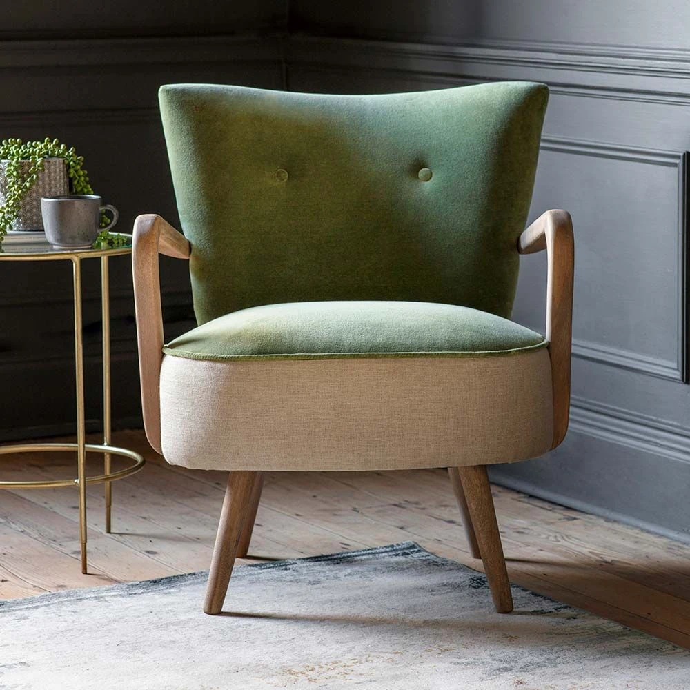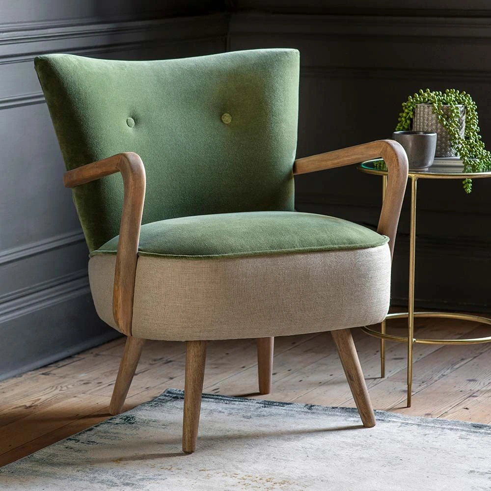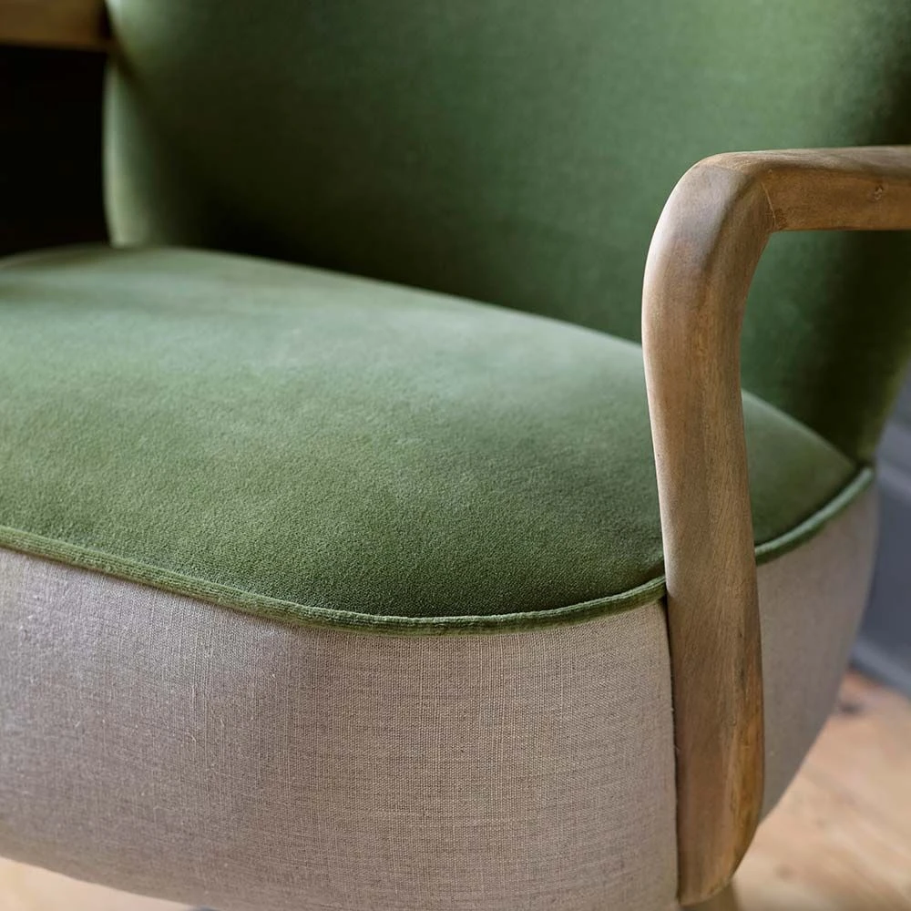 Classic style, smooth curves and luxurious feel of a velvet – discover our retro armchair Calvin in Olive Green. Our mid-century inspired armchair with sleek wooden handles, contoured legs, a contrasting natural linen base and rich velvet in sumptuous olive green, this chair is an alluring statement piece that will look gorgeous in any room. Available in lively, intense colours, this green armchair can transform the most basic interior into something instantly more luxurious. The Rich and elegant velvet of this retro chair will help to create that bold, eye-catching accent in your space.