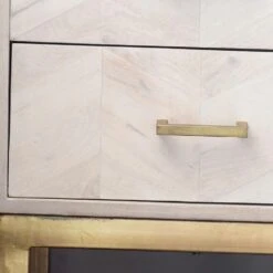 An eye-catching cabinet perfect for master bedrooms, teen rooms, guest rooms or even a home office, our Chevron Bedside Drawers provide plenty of storage for night-time essentials with two drawers and a detailed whitewash mango wood design. The brass plated frame and handles add a luxury touch and for a co-ordinated effect, our matching Chevron Chest of Drawers will give your room a feeling of boutique hotel chic.
