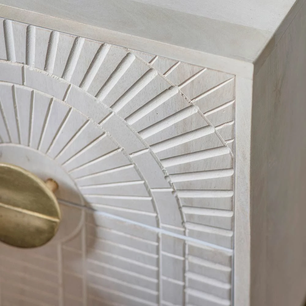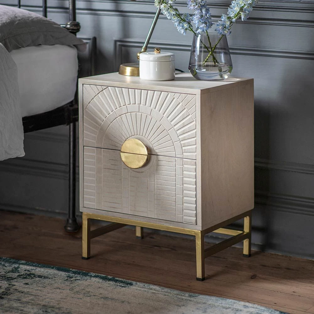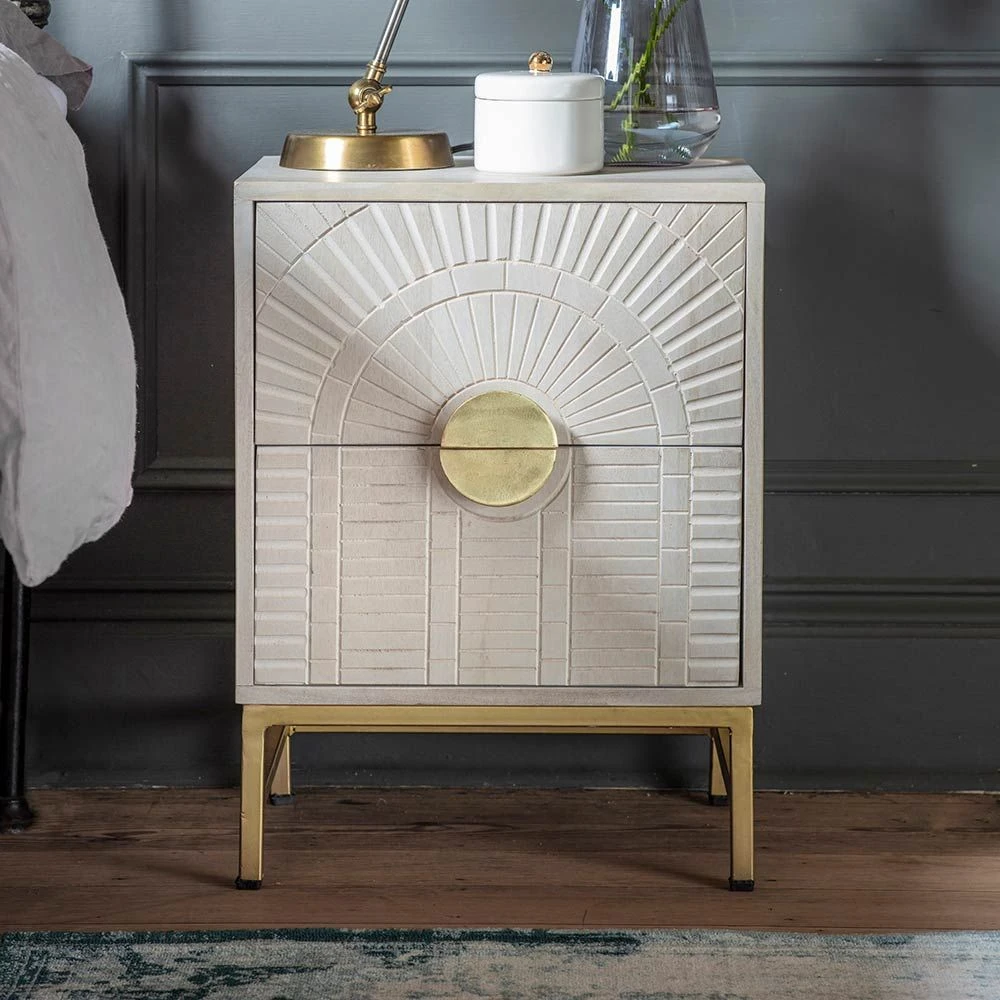 Inspired by the luxurious glamour of the Art Deco period, our new Coco Bedside Drawers are sure to make a statement in any bedroom design. Practical and handy with two drawers, they are made from whitewashed mango wood with brass plated legs and handles for instant chic appeal.