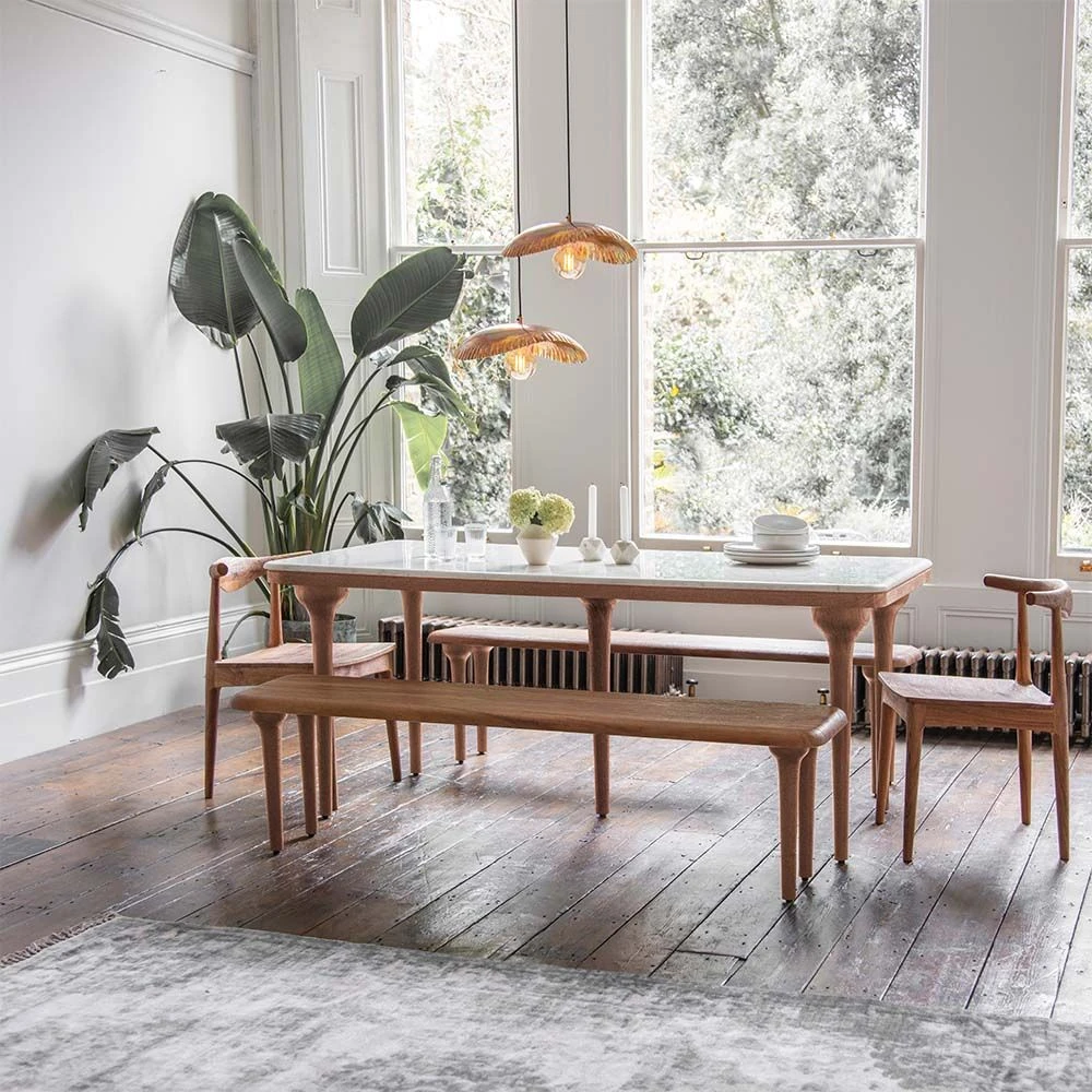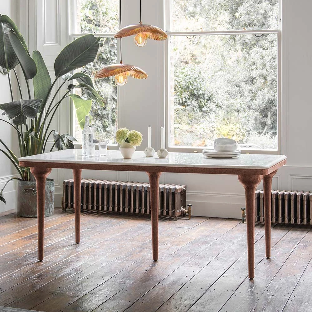 A statement six to eight seater table for the dining room or open-plan kitchen, our Cone Marble Dining Table in solid wood is a design-led piece inspired by nature’s organic shapes. Combining cool white marble with solid acacia wood and robust solid turned wooden legs, this hand crafted table has been skillfully wire brushed to draw the natural wood grains out for a more tactile feel.