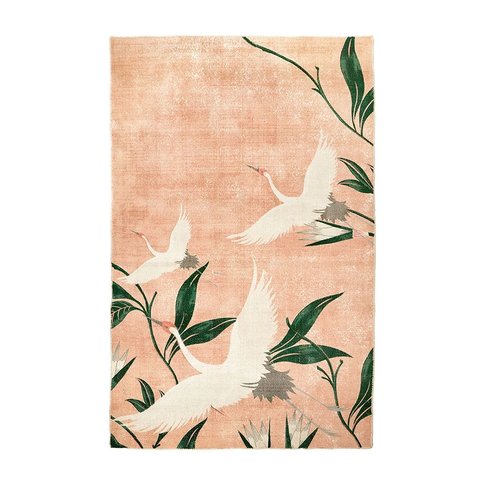 Our statement Crane Rug is inspired by classical grand rooms in its on-trend colour combination of deep pink and olive green featuring swooping cranes that bring nature into your home.