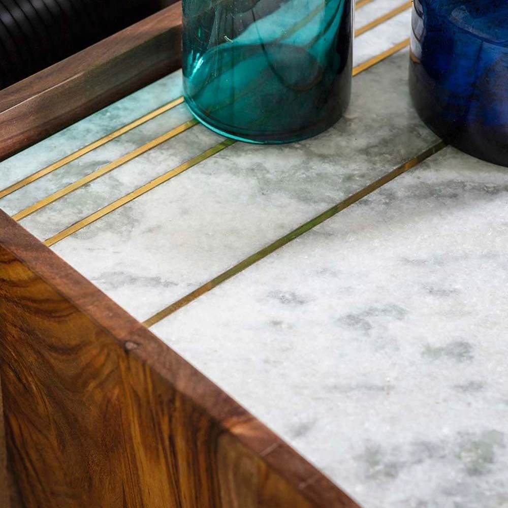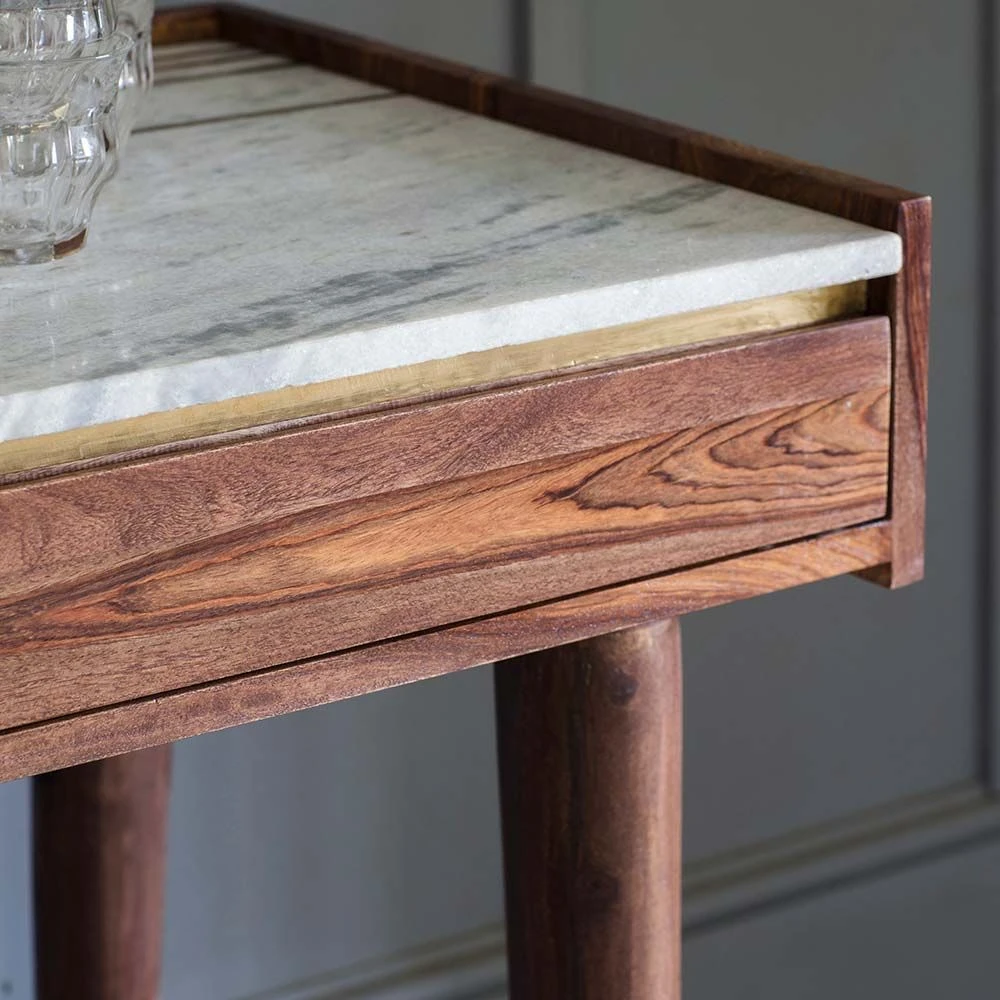 Whether you work at home or simply need somewhere to sit and sort out the household bills and paperwork, our Deco Marble Desk Console is perfect for catching up and concentrating. Manufactured from distinctive rosewood wood with a contrasting white marble top and elegant brass inlay, it would look equally striking in an office, bedroom, living area, dining room or open-plan space. It could also work as a quiet study area on a large landing and is handy for all family members. It also incorporates two drawers to keep letters, bills and filing neatly stored away yet within easy reach.