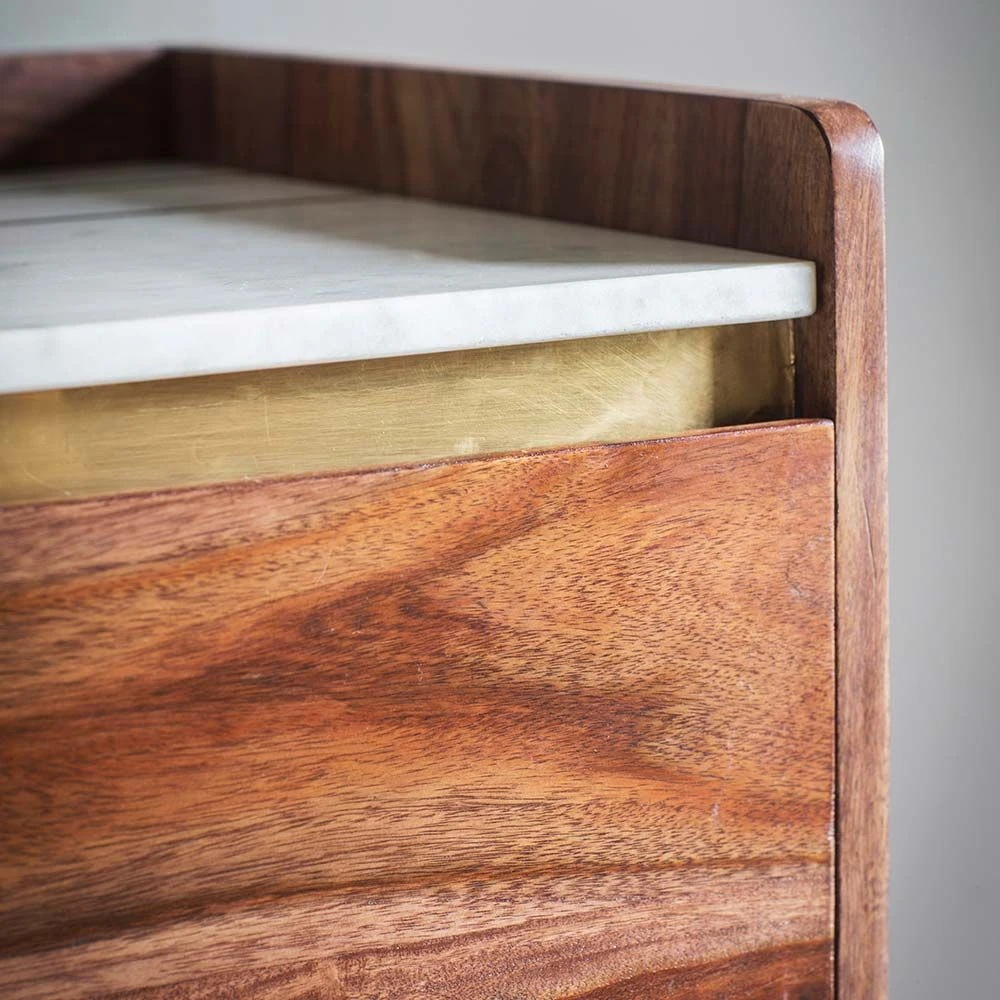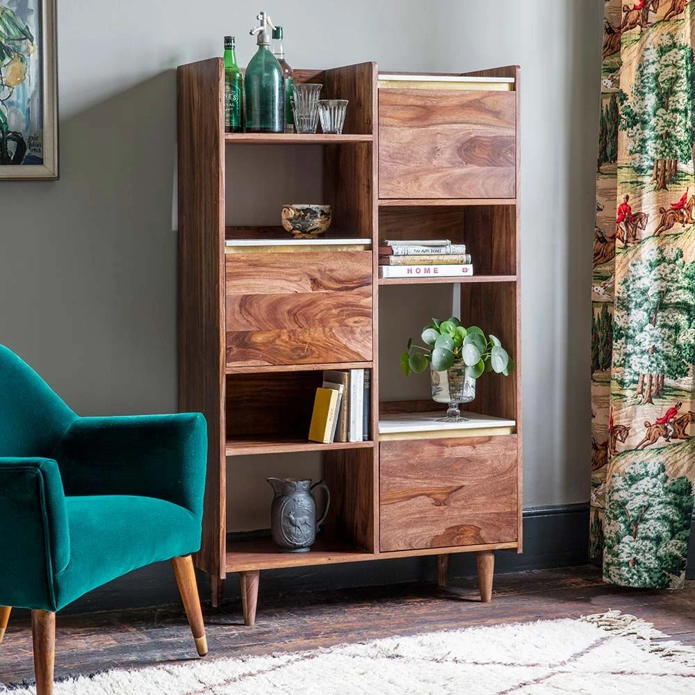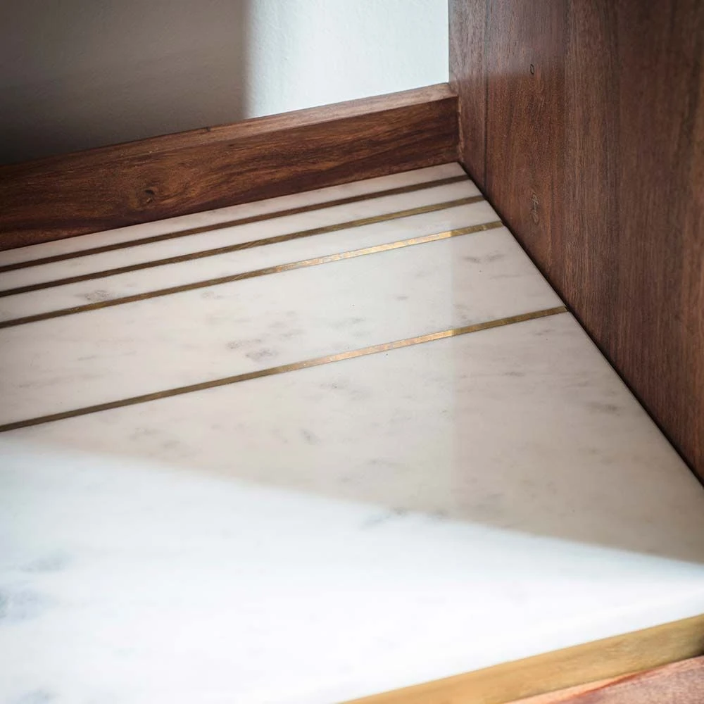 Our Deco Marble Bookshelf has a distinctive rosewood design with white marble surfaces set within the open shelving, which is finished with luxury brass detailing. It would look stunning in any space, from a living area and dining room to a home office, guest room or even in a spacious hallway or landing.