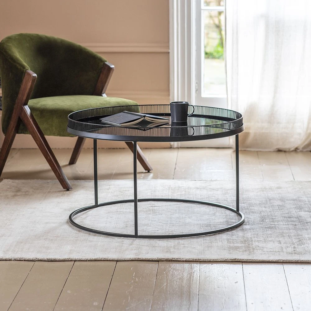 A truly multifunctional piece of furniture, our Doris Coffee table comes with a removable tray top so you can easily take the top off and use as a tray to serve drinks and nibbles to family and friends The black powder coated base provides a striking contrast to the brass tray top.