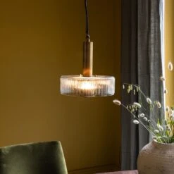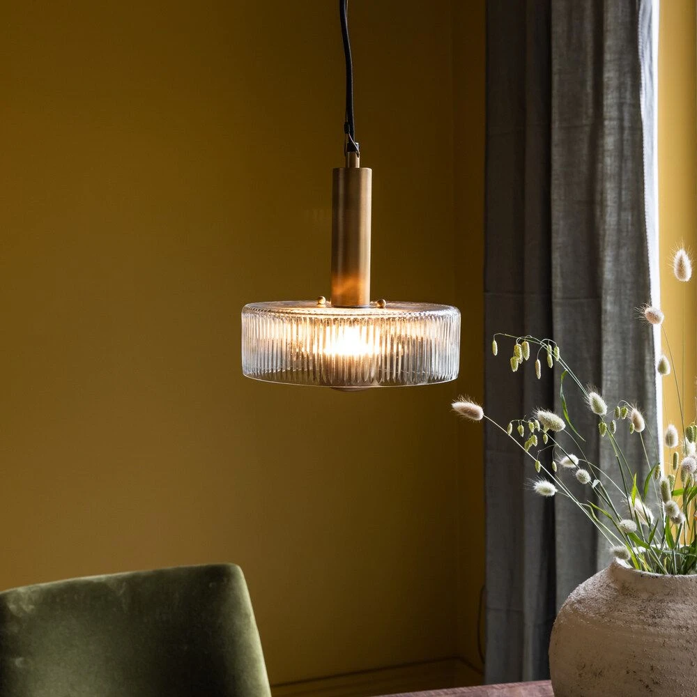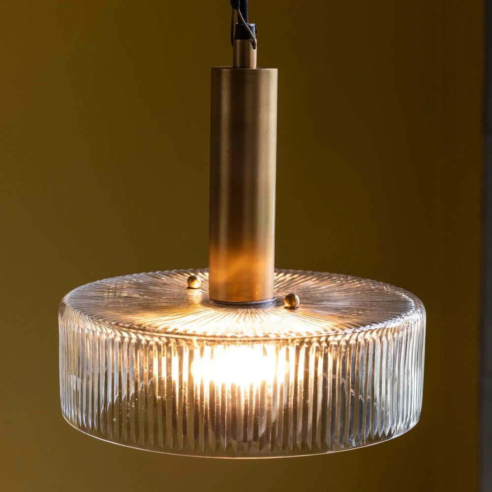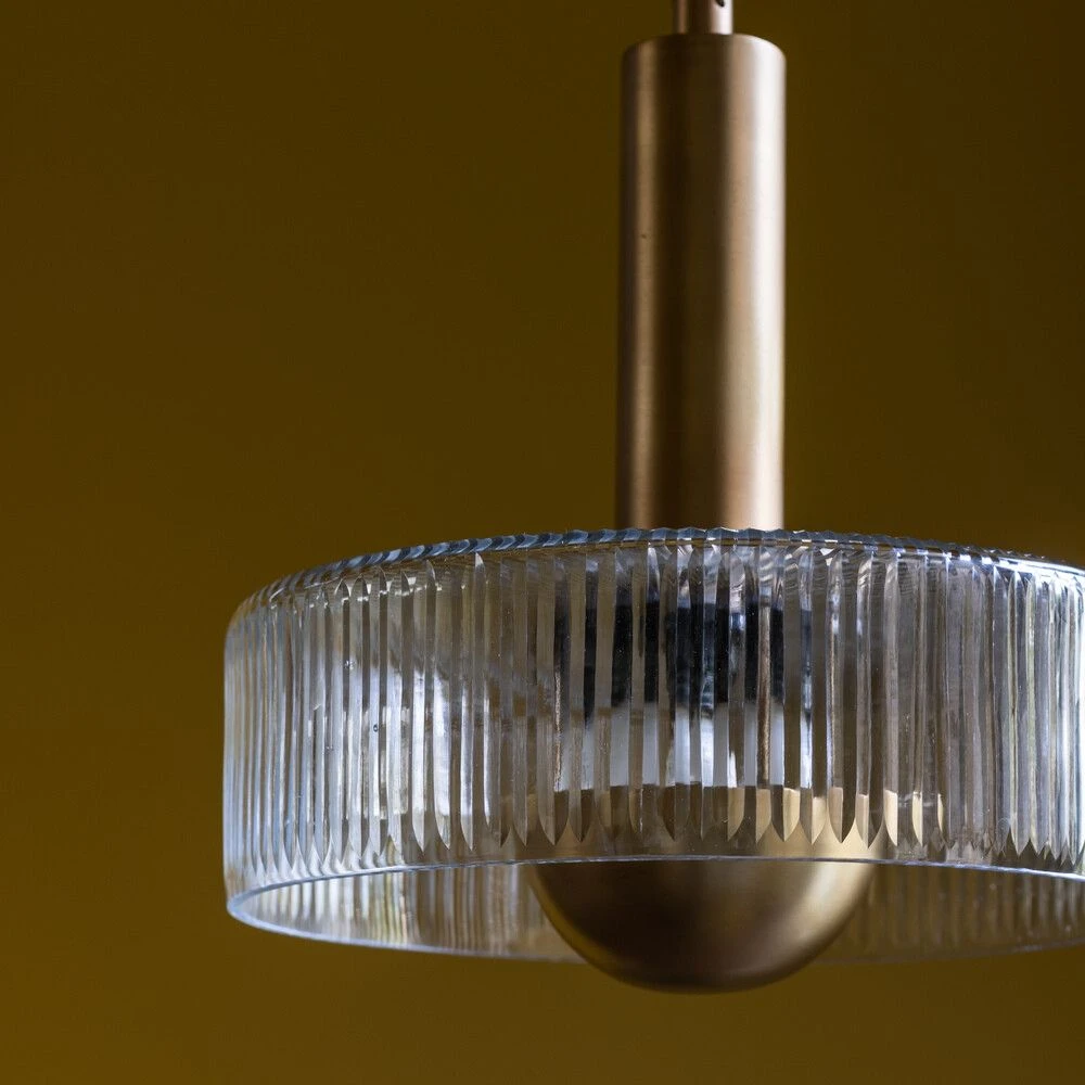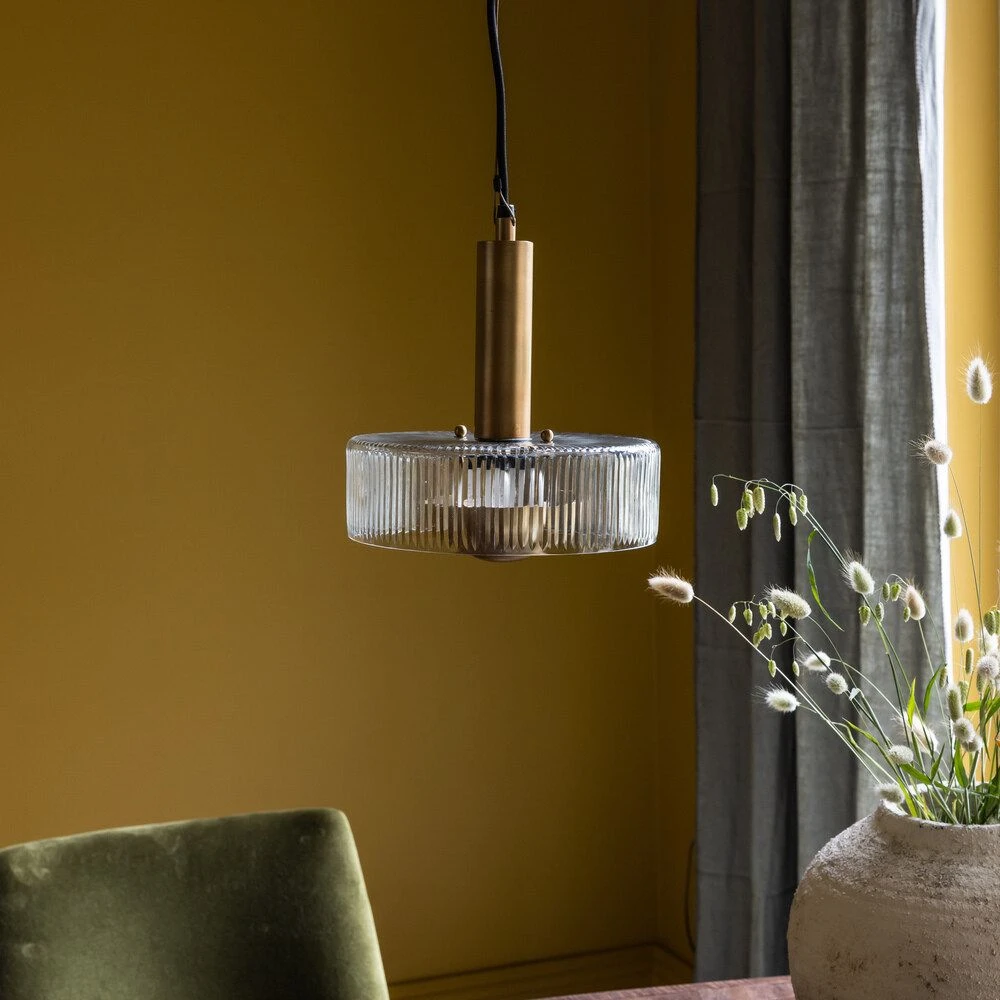 Its fluted clear glass pendant is given added luxury and glamour with an antique brass dome that softens the light, along with a luxurious brass stem and chain.