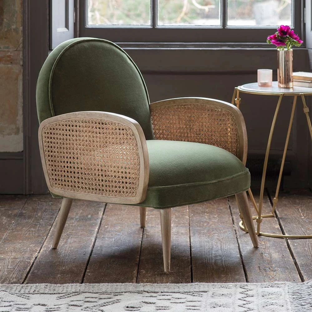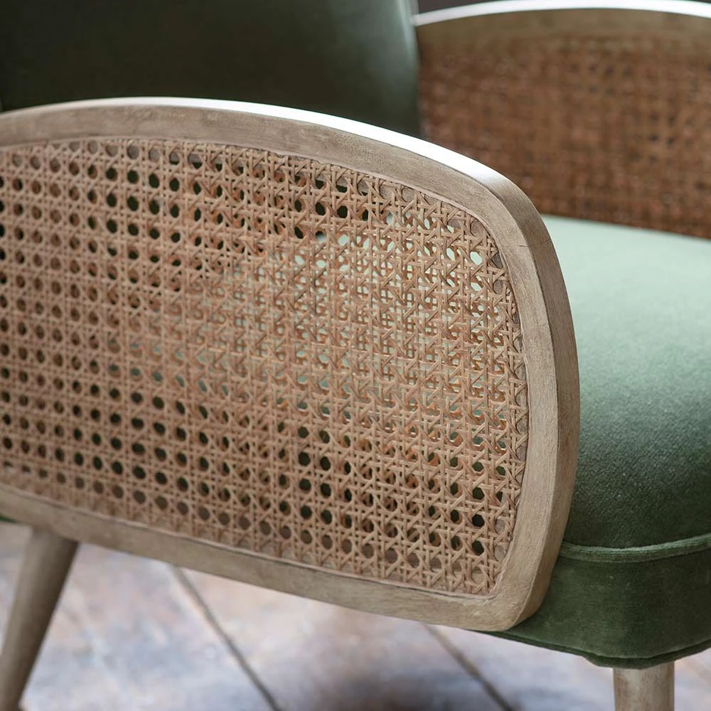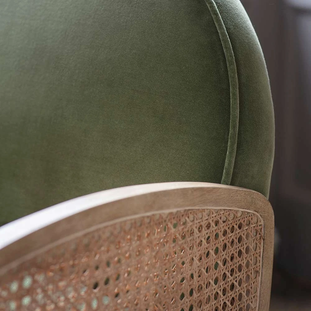 We love the Art Deco feel of this cane and olive velvet Emmeline Armchair with its curvaceous cushions and arms and contrasting colours and textures. Offering plenty of feel appeal as well as a soft, squishy look that longs to be sat in, add it to the living room, bedroom or an open-plan space and settle in for the night with your favourite book. It would also look stunning in a dressing area or even a luxurious bathroom complete with roll-top tub.