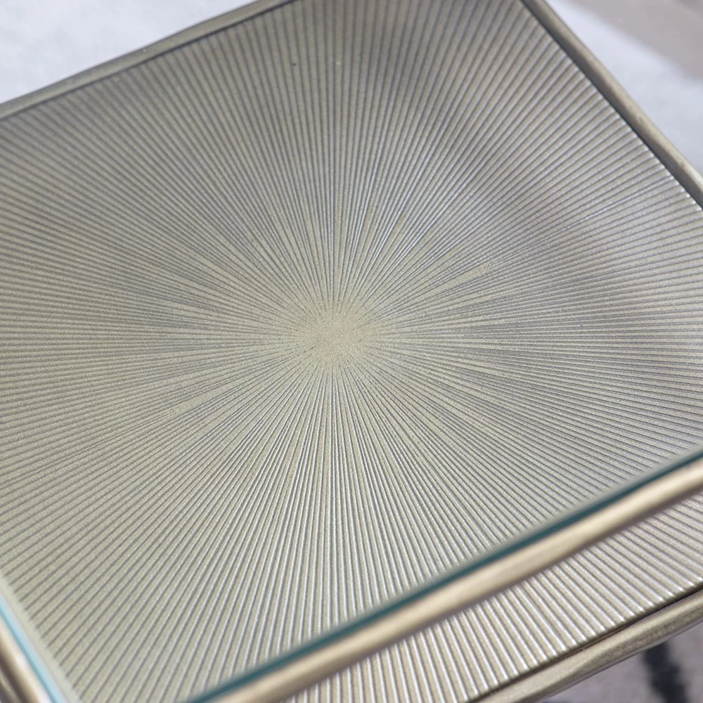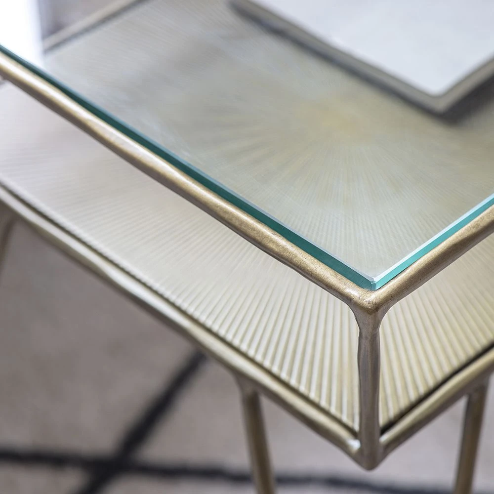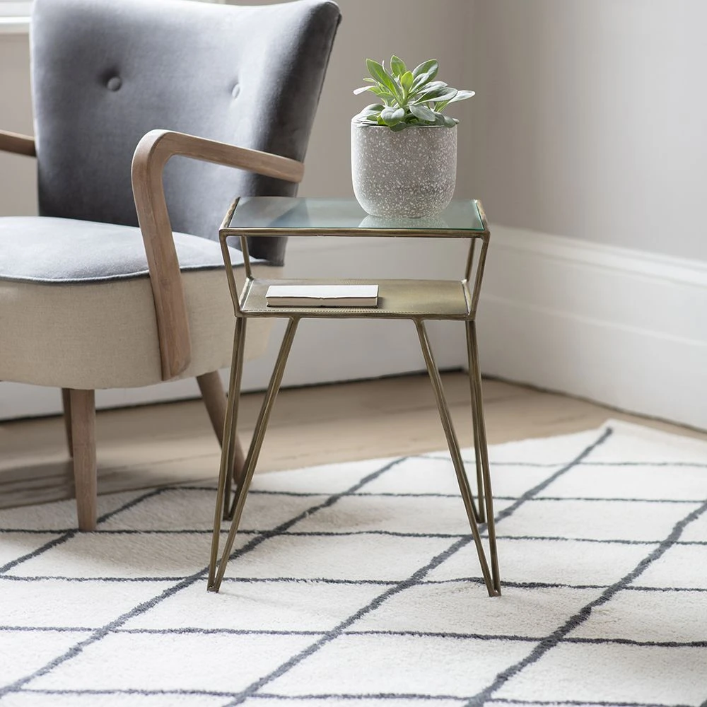 Our Etched Side Table with storage shelf is sleek and contemporary, with a subtle iron frame, and slimline design.