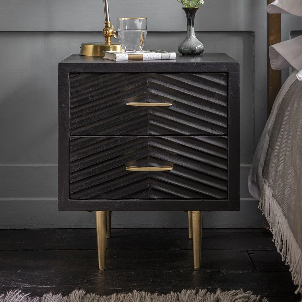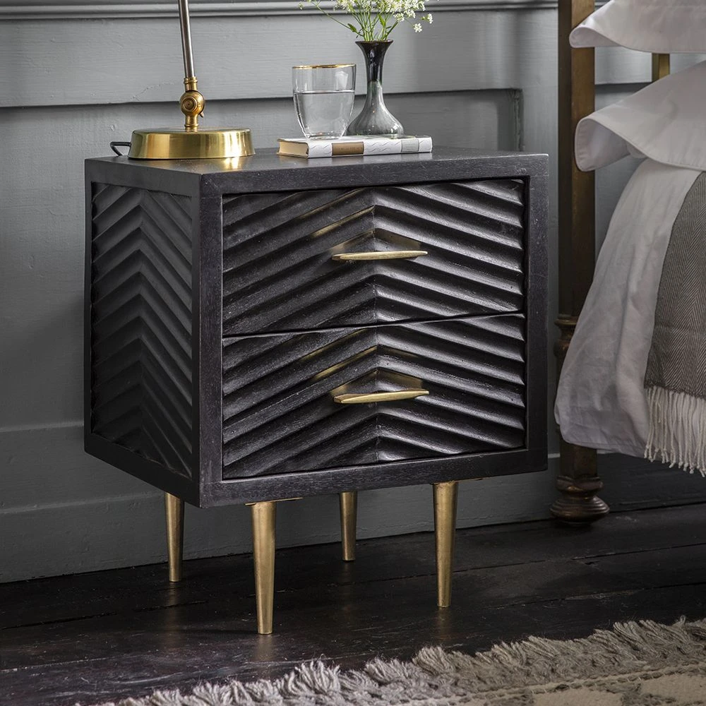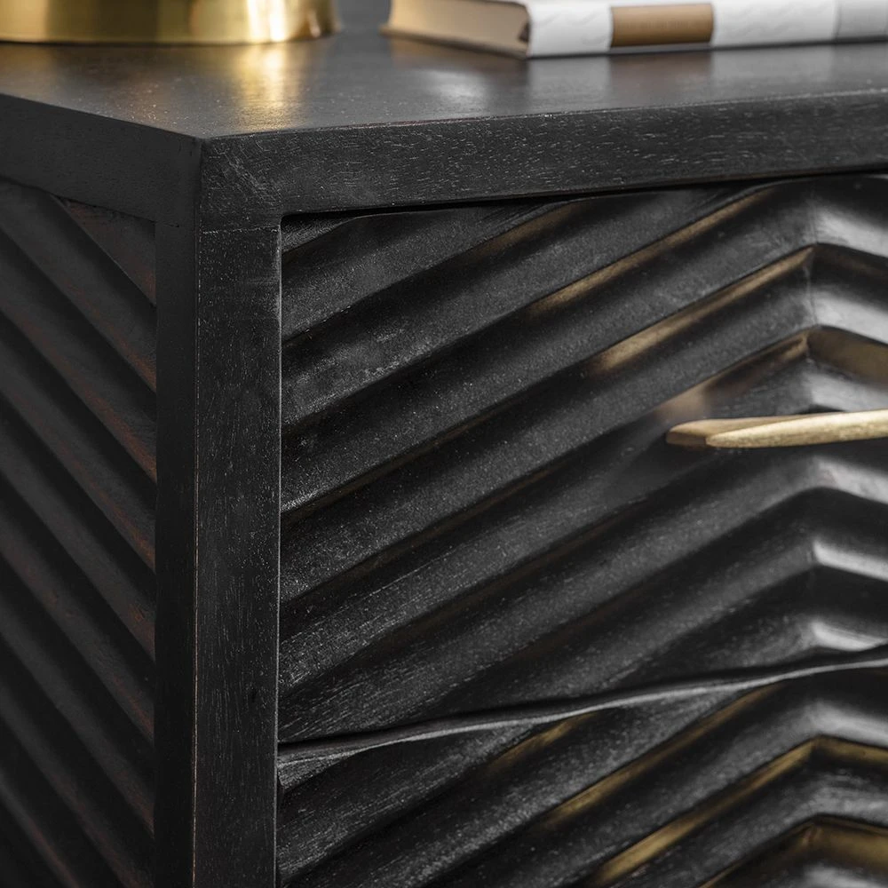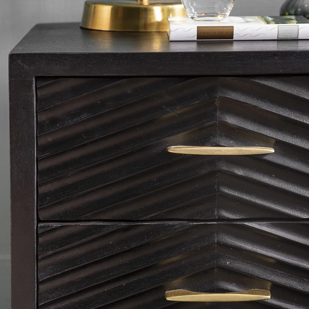 Create a focal point in the bedroom or guest room with our striking Fandango Bedside Drawers. The ridged black stained mango wood finish is complemented beautifully with brass-plated legs and handles while the two-drawer design provides plenty of handy storage. A matching sideboard, chest of drawers and media unit are also available for a fully co-ordinated look throughout your home.