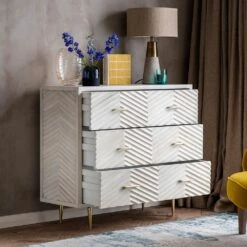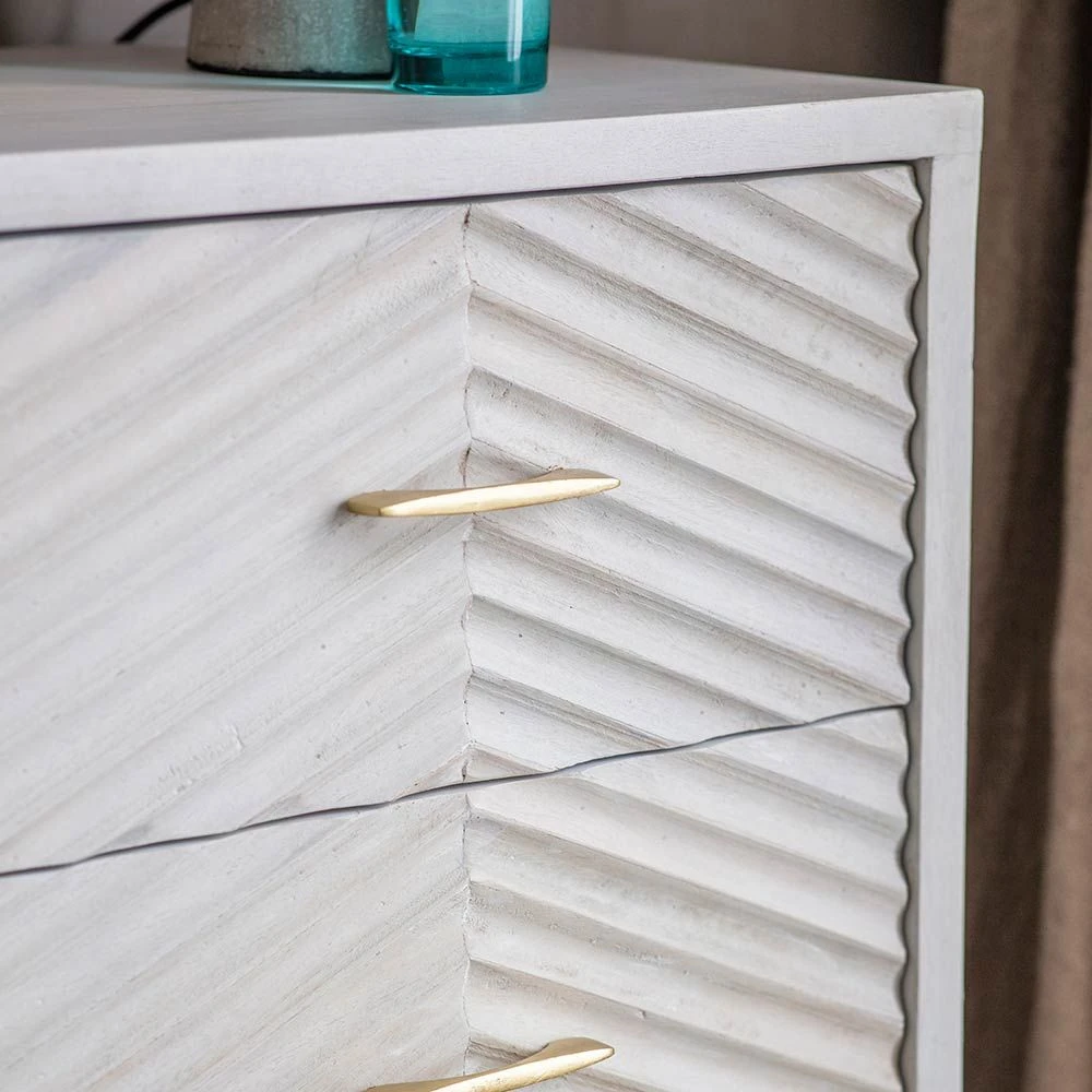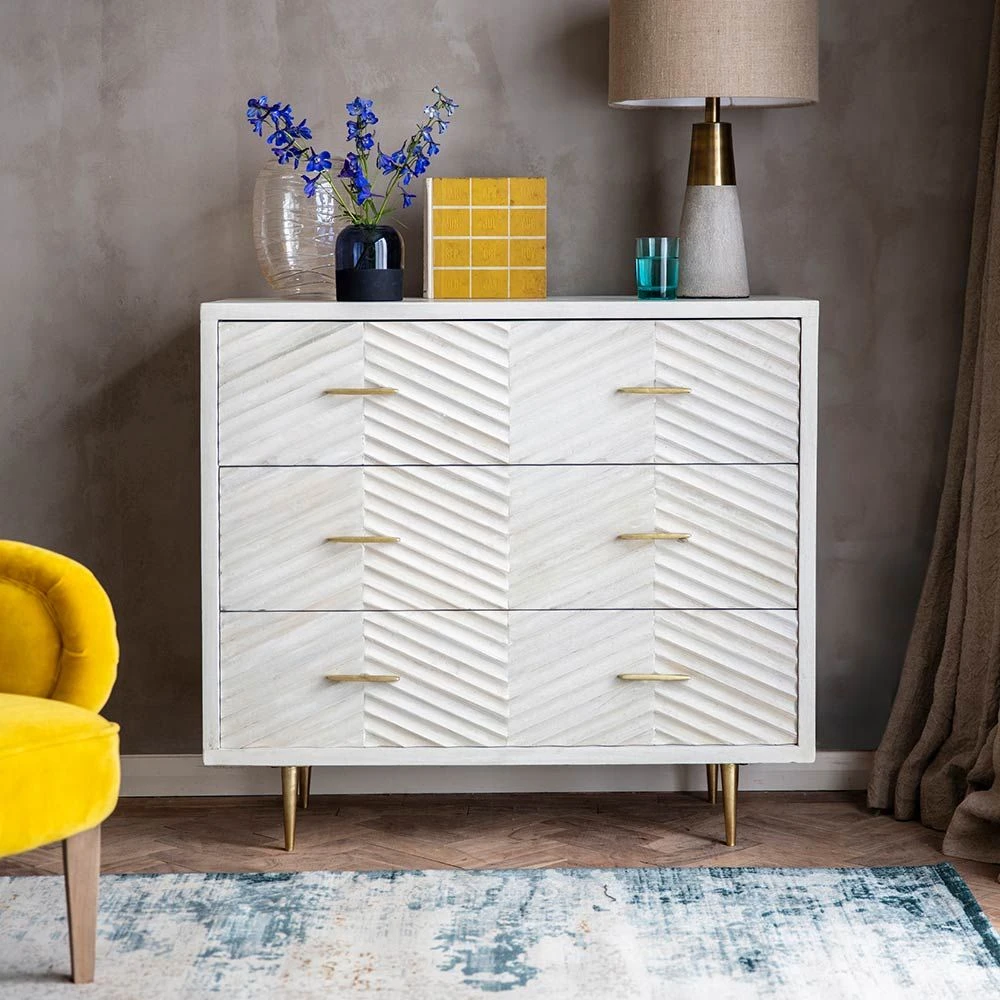 There’s plenty of storage space for clothes and accessories in this three-drawer Fandango Chest of Drawers. With its distinctive whitewashed mango wood finish and brass-plated legs and handles, it’s sure to make a statement in any bedroom scheme. Use as a standalone piece to create instant impact or for a co-ordinated look throughout your home, check out our matching sideboard, media unit and bedside drawers.