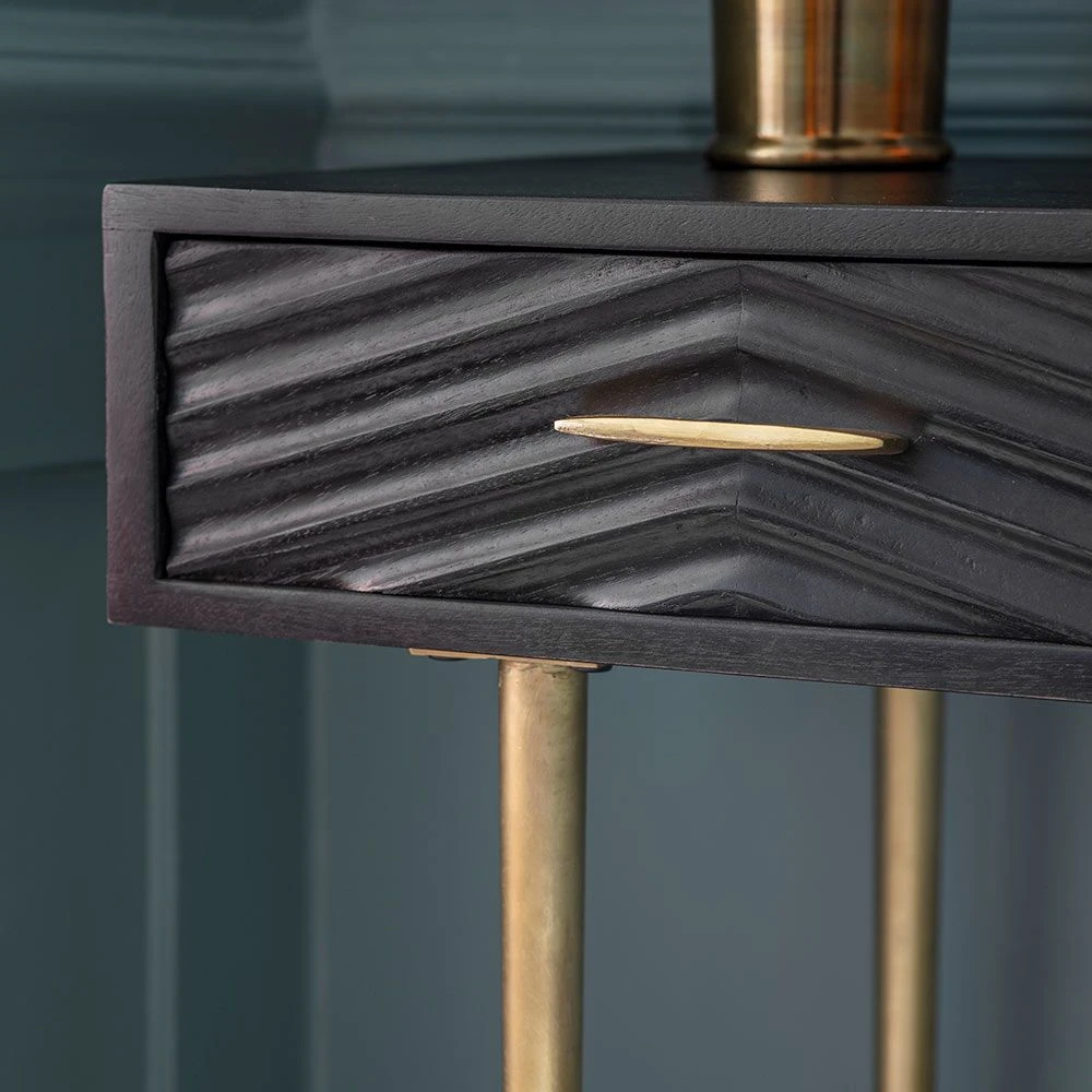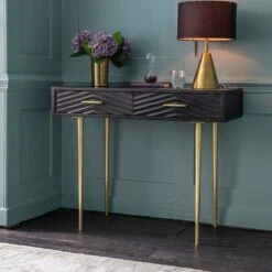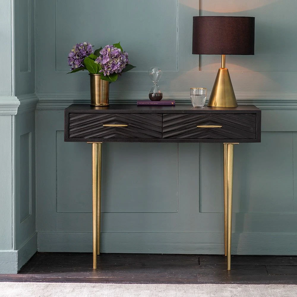 We think our Fandango Console would make a fantastic dressing table as its distinctive black stained mango wood finish with brass-plated legs and handles oozes luxury and elegance. The two drawers provide handy storage for jewellery, make-up and accessories. It could also be used in the hallway or on the landing for keys, chargers and bills as well as a desk area for a home office or open-plan space.