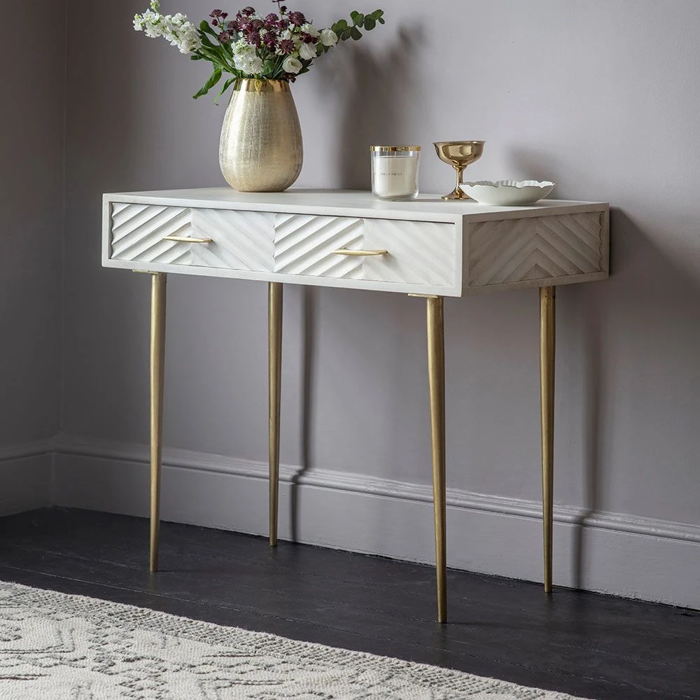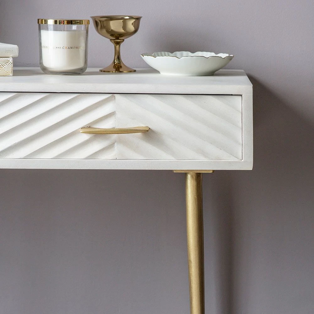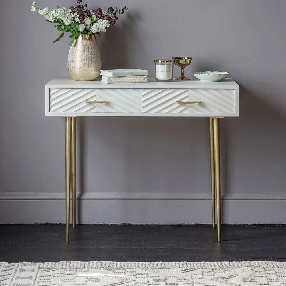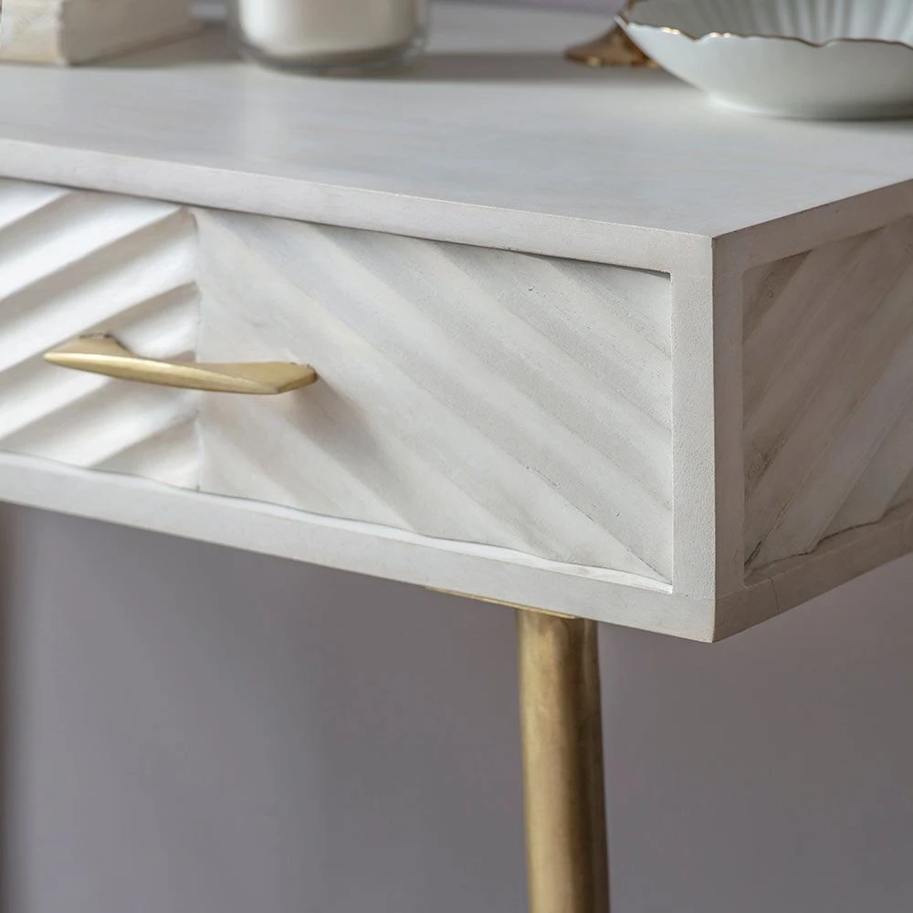 We think our Fandango Console would make a fantastic dressing table as its distinctive whitewashed mango wood finish with brass-plated legs and handles oozes luxury and elegance. The two drawers provide handy storage for jewellery, make-up and accessories. It could also be used in the hallway or on the landing for keys, chargers and bills as well as a desk area for a home office or open-plan space.