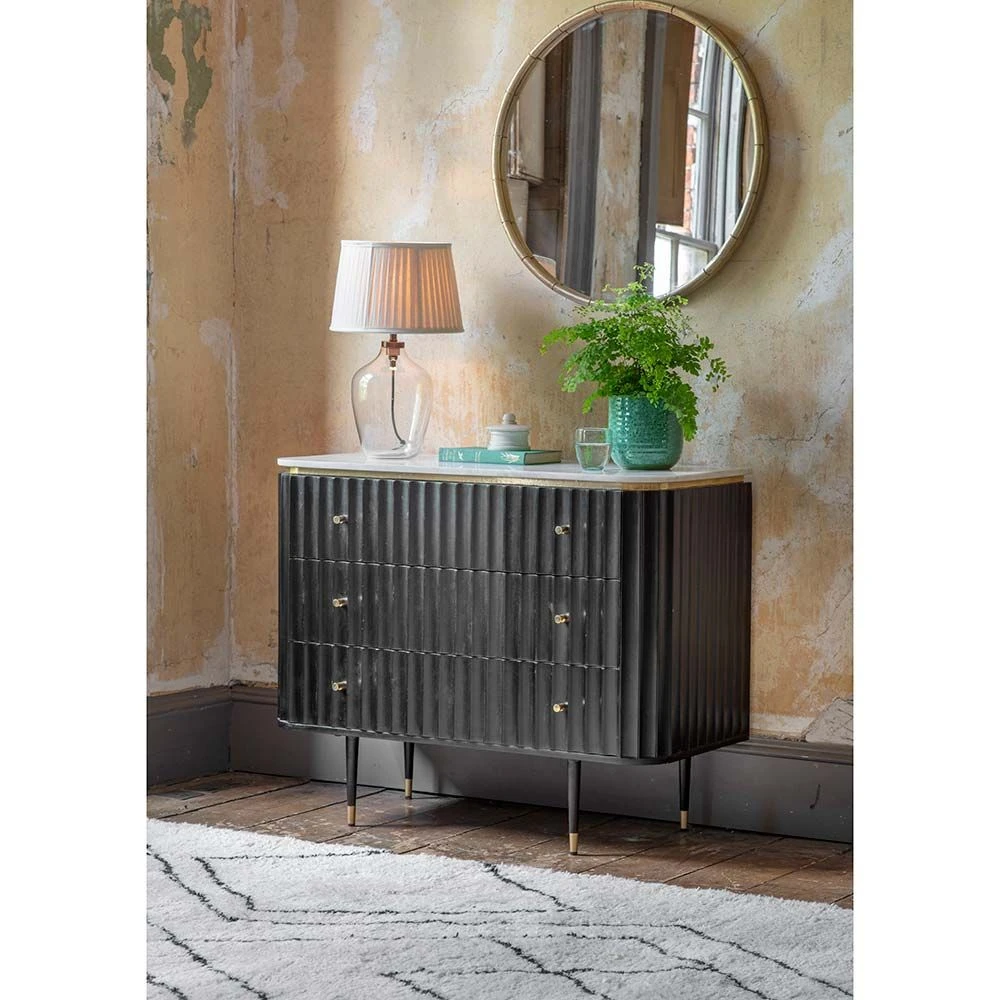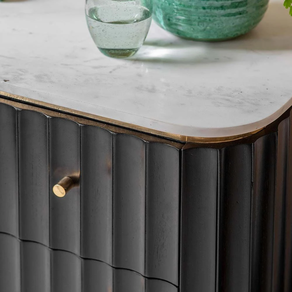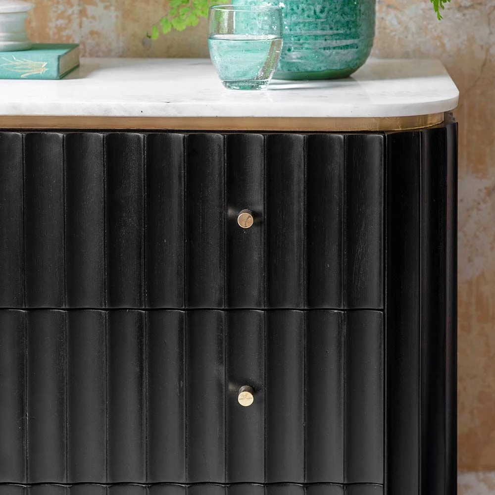 Bring some extra storage into the bedroom or guest room with our Flute Marble Chest of Drawers. We love its elegant black stained acacia wood design with on-trend white marble top and brass cladded edging, which is complemented by brass plated handles and black legs with brass caps. Subtle and understated, it offers three drawers for tops, t-shirts and underwear and is effortlessly elegant with its curved ends and Mid-Century Modern meets Scandi look.
