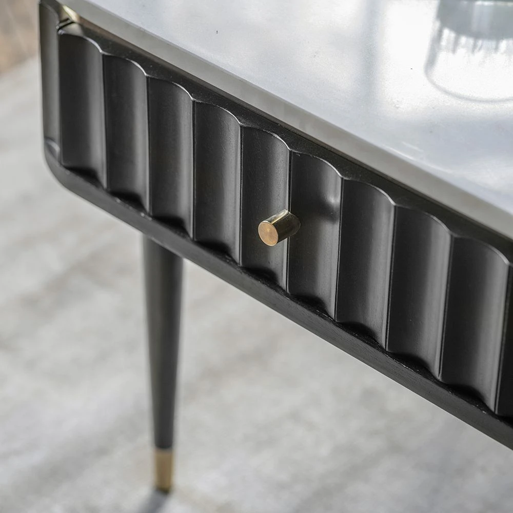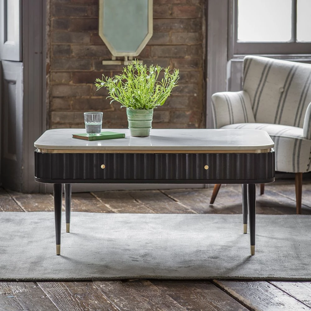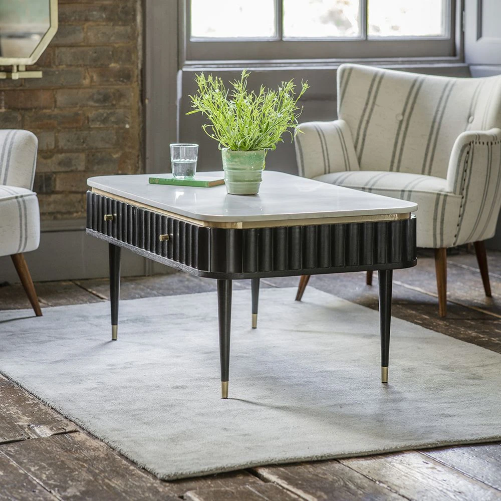Add the wow factor to the living area with our Flute Marble Coffee Table. Crafted from black stained acacia wood with a contrasting white marble top it’s stunning as well as practical with four handy drawers to keep all those essentials you don’t necessarily want on display.