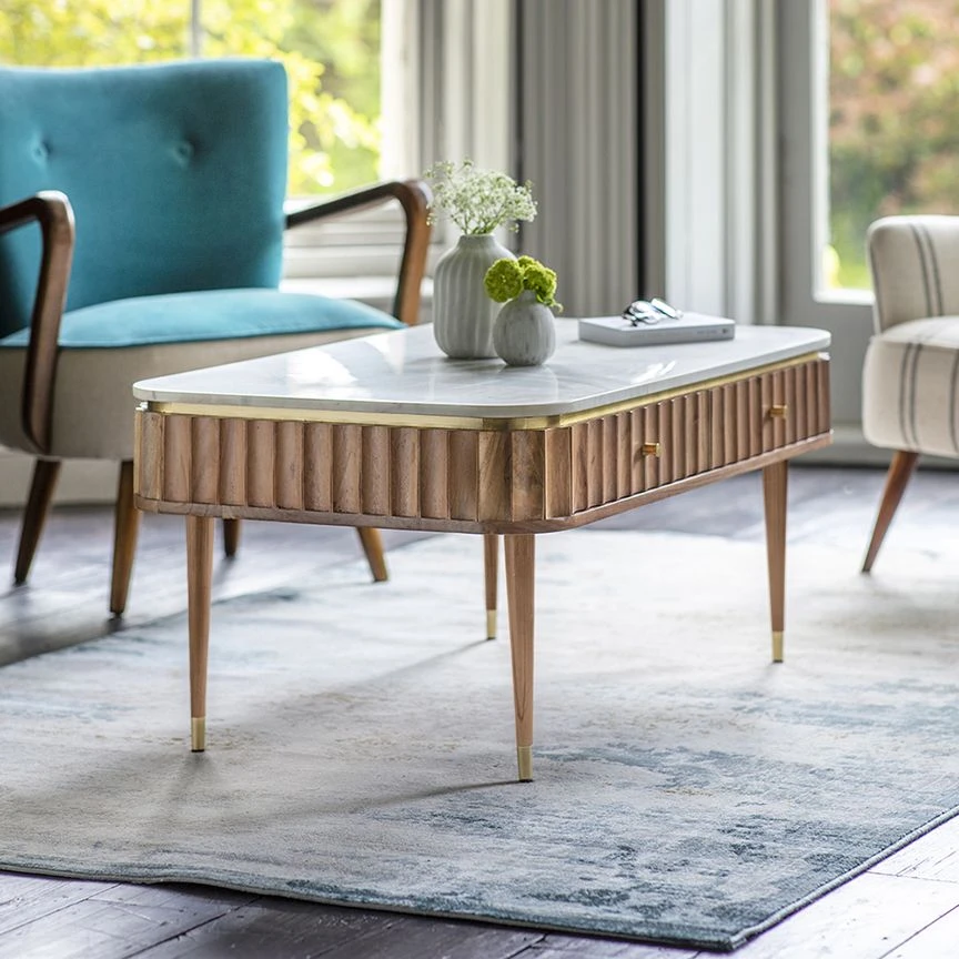 Add the wow factor to the living area with our Flute Marble Coffee Table. Crafted from acacia wood with a gorgeous white marble top and natural wood legs with a brass foil detail it makes a stunning centrepiece for your living room. It’s practical too, with four handy drawers to keep all those essentials you don’t necessarily want on display.