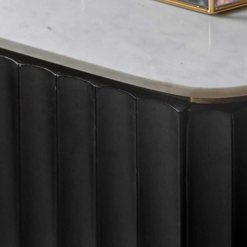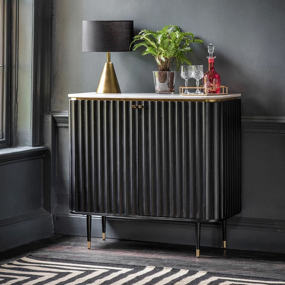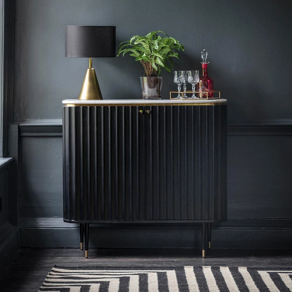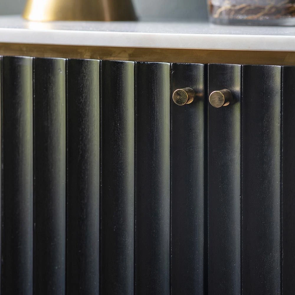 Featuring softly curved ends, our Flute Marble Drinks Cabinet looks stunning in a black stained acacia wood with hardwearing white marble top. In keeping with the trend for using white marble in interiors, this cabinet is both practical and stylish and is perfect for entertaining. It comes with brass cladded edging, brass plated handles and black legs with brass caps and can be used to display, store and serve drinks and glassware.