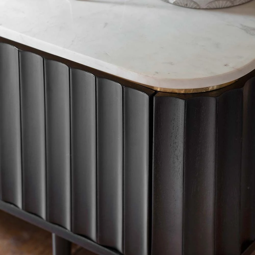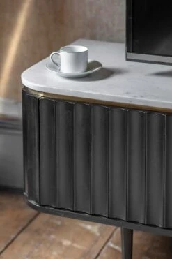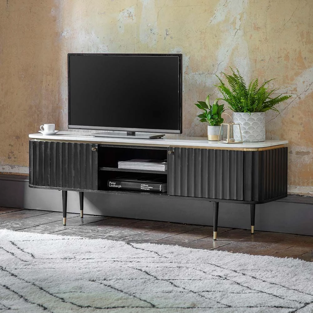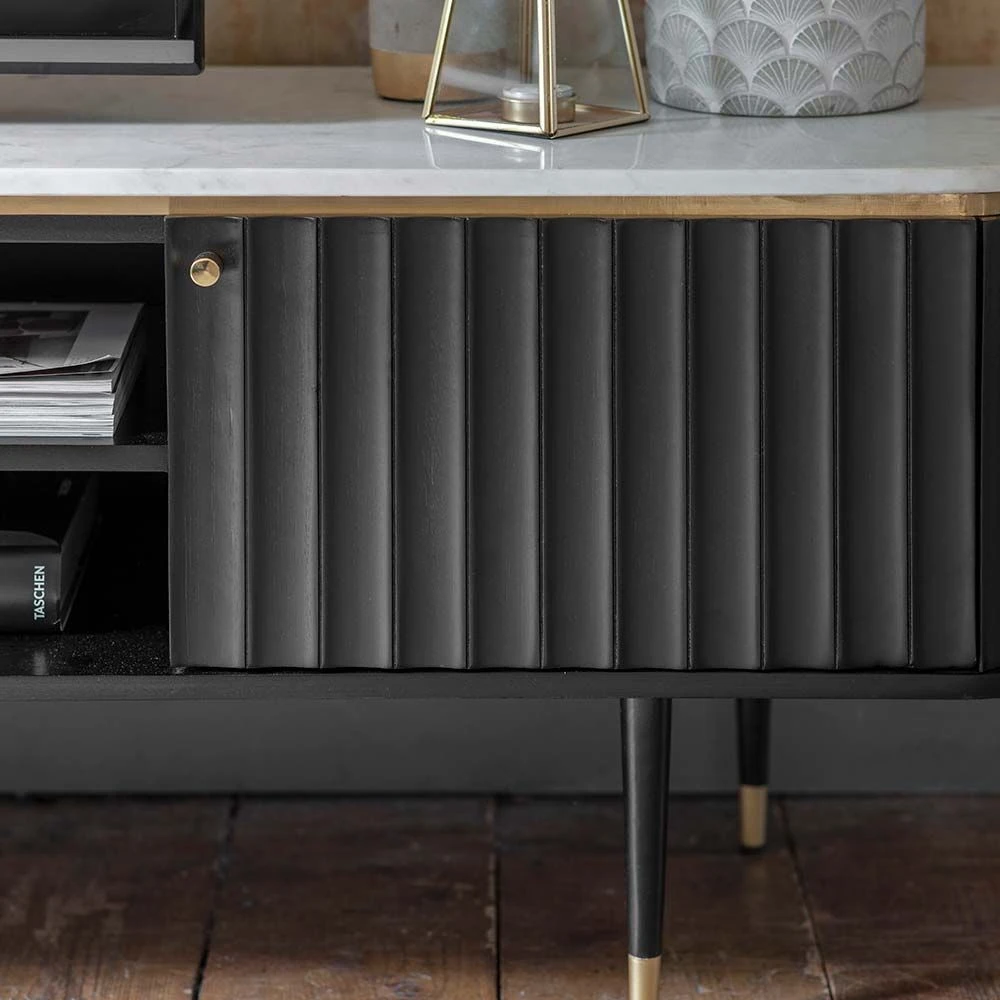 Perfect for storing and displaying the TV, music systems, set-top boxes and games consoles, our Flute Media Unit is ultra-practical with an on-trend Mid-Century Modern meets Scandi look. In an elegant black stained acacia wood with a white marble top, it also features brass plated handles and contrasting black legs with brass caps. Use it in the living room or an open-plan kitchen-living-dining space with a different zone for relaxing and entertaining.