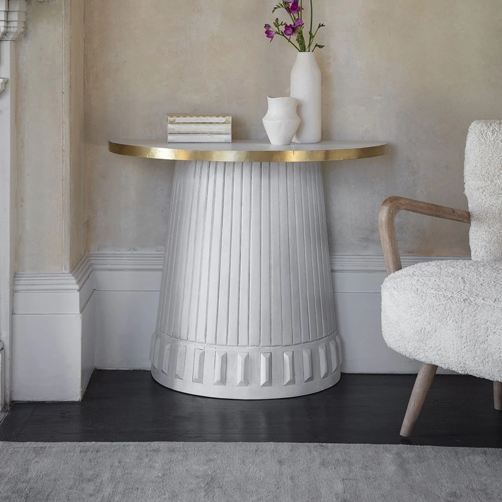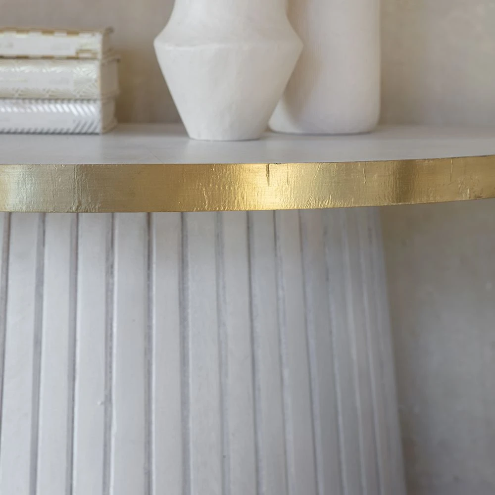 This white half-moon console table will complement any interior and any décor and is a practical and handy tabletop for keys, letters, bills and all those things you tend to forget before leaving the house. It also looks stunning in a living area or dining room.