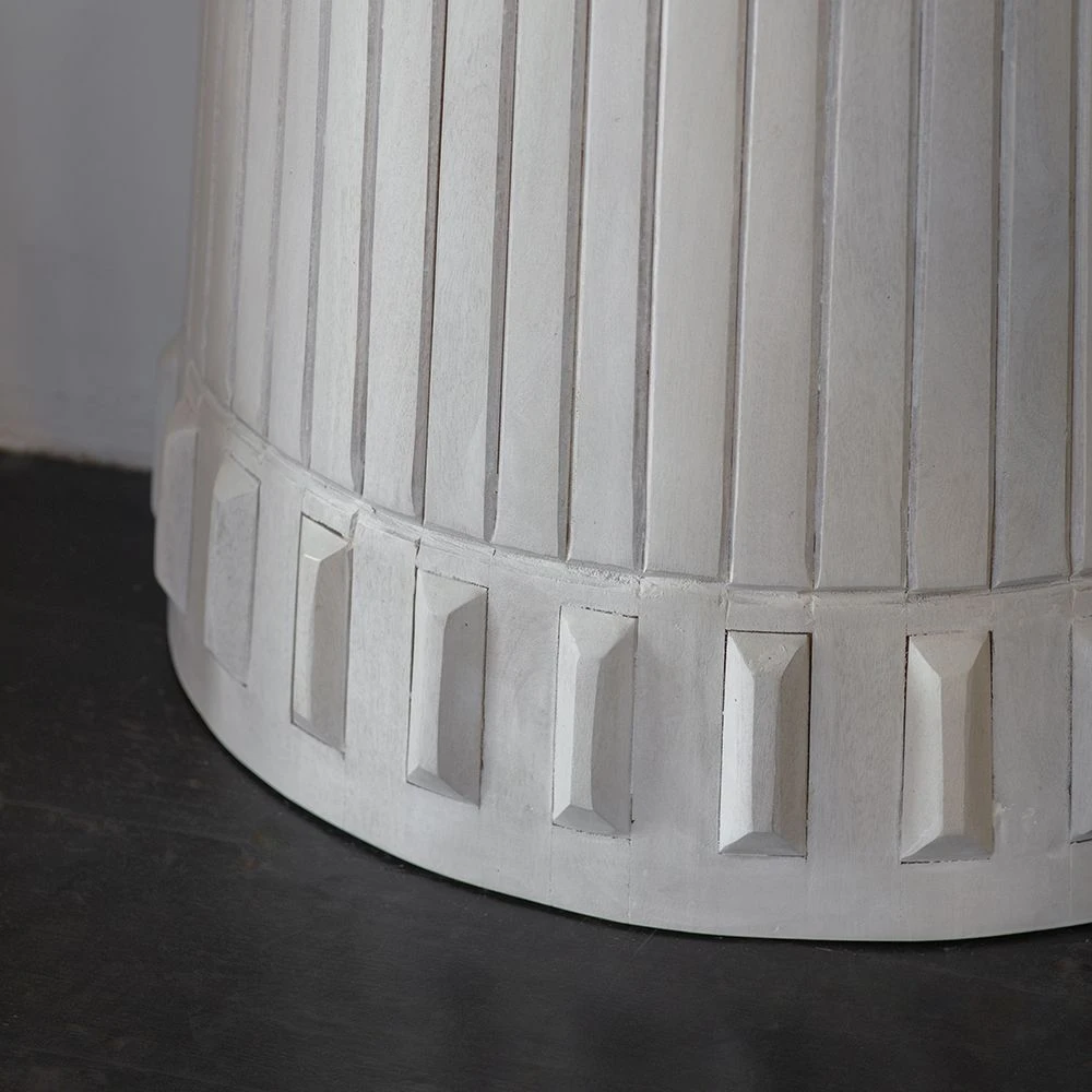 The tabletop features a subtle sunburst parquet wood design in the same whitewash wood effect as the rest of the piece, and the base includes hand crafted wood decoration. This sturdy hallway table is one that will last for years to come.