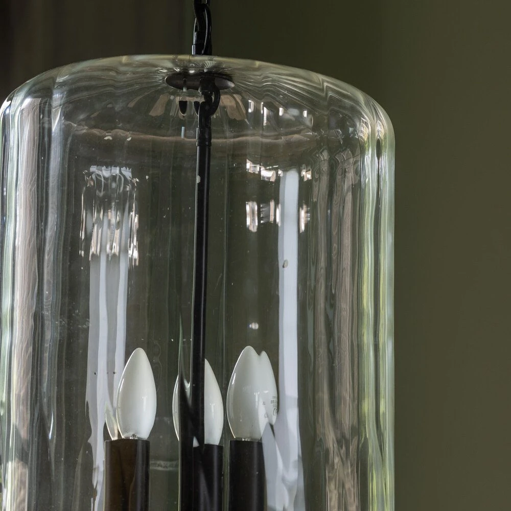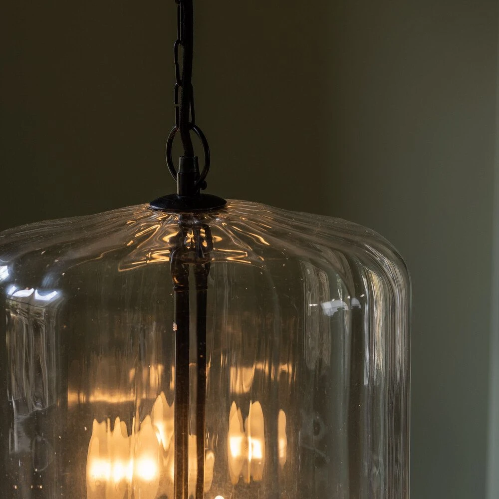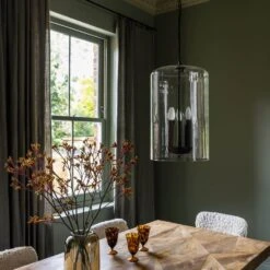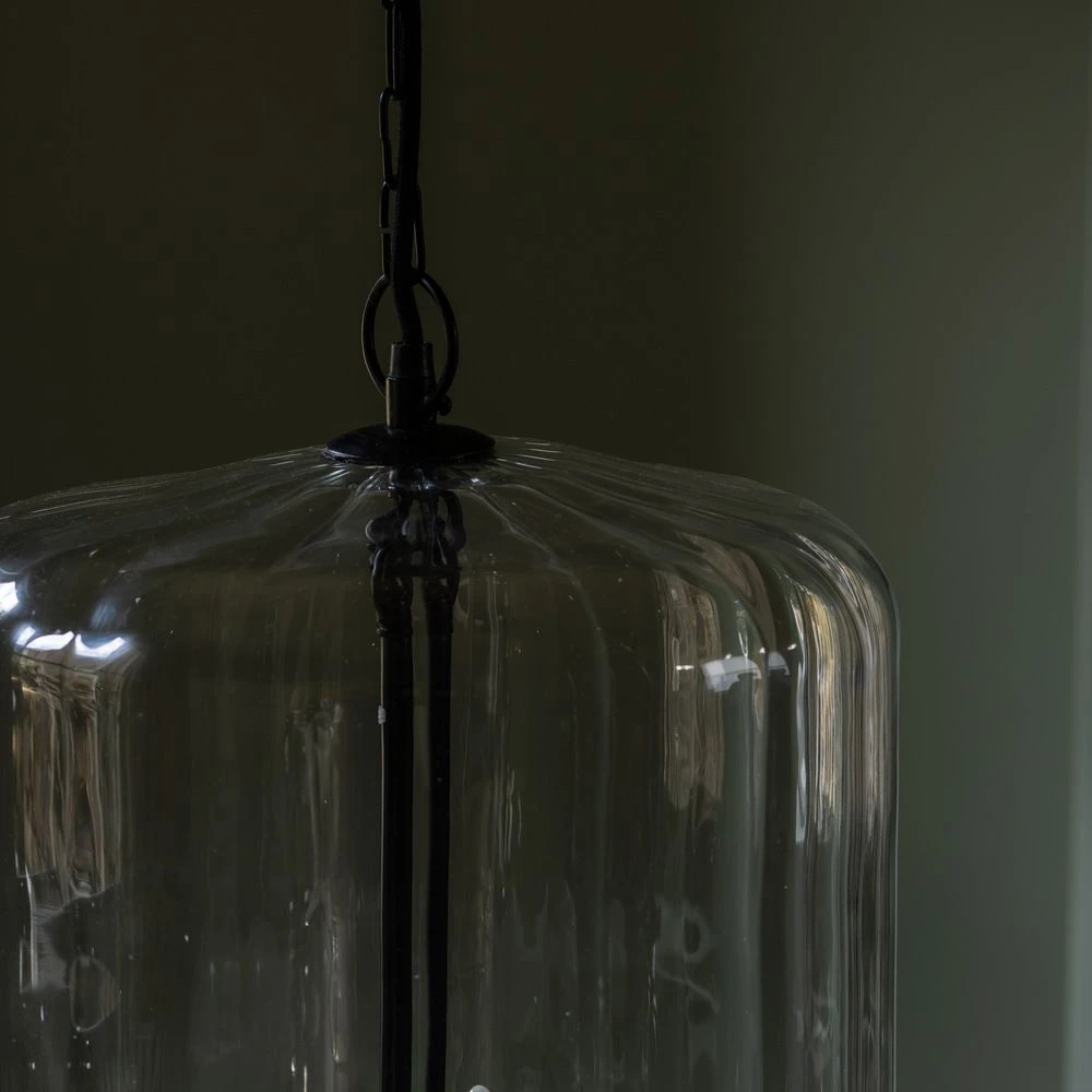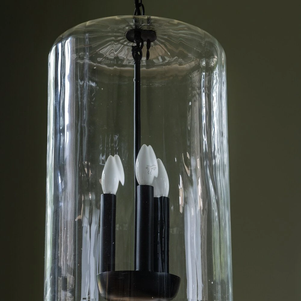 This large statement light has a large blown clear glass dome with three black metal candle-style lamp holders.