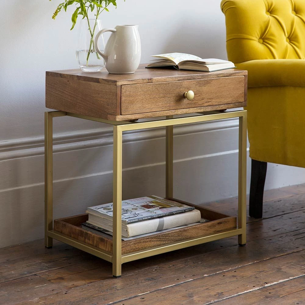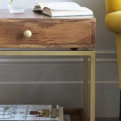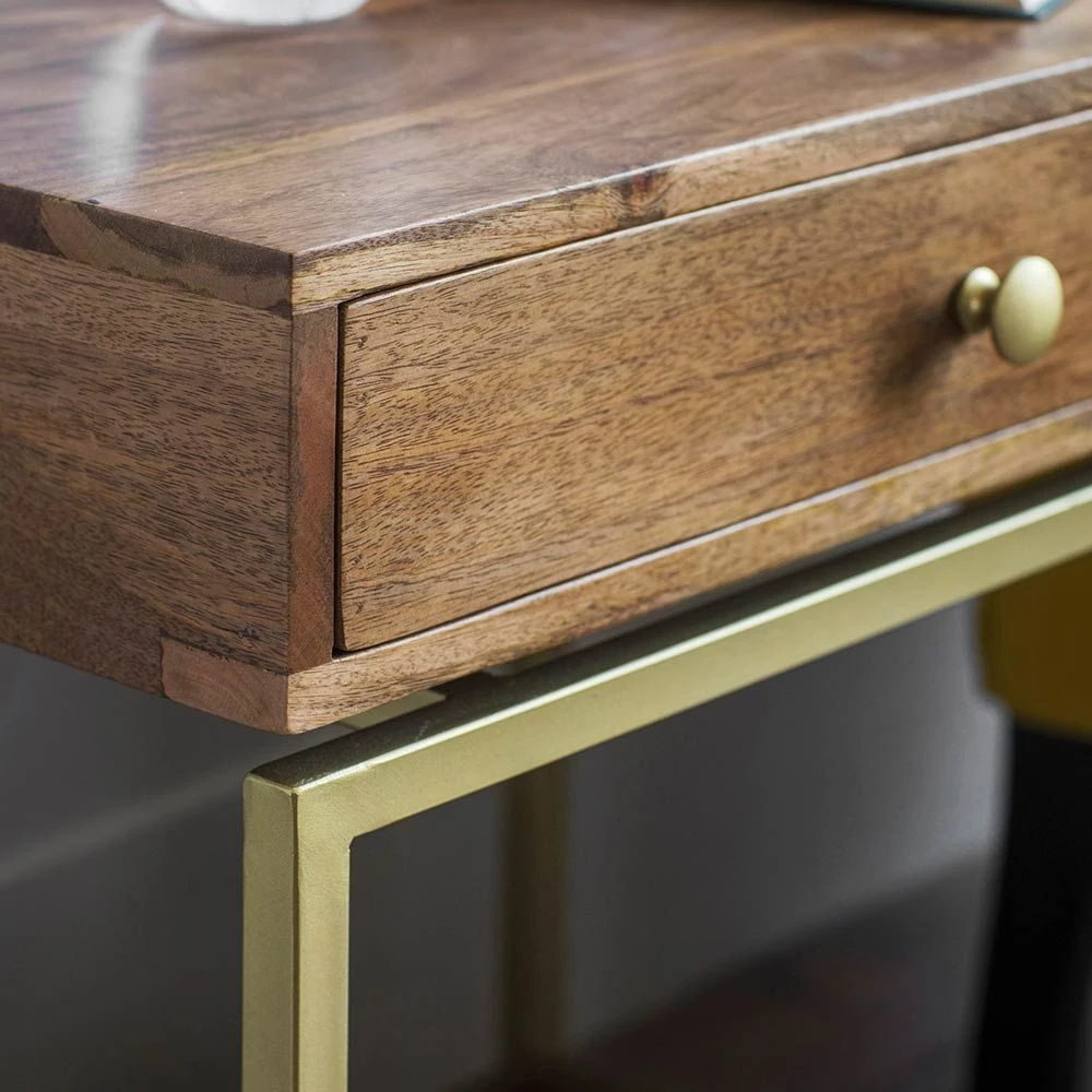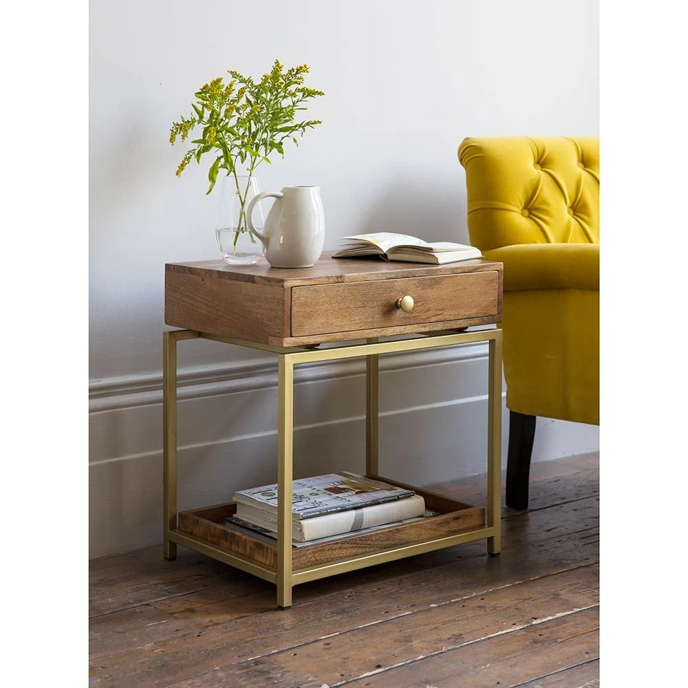 We love the rustic simplicity of our Henley Side Table, which is perfect for all styles of interior. Expertly crafted from mango wood with a brass powder coated iron fram, the floating shelf design offers plenty of storage space with a handy pull-out drawer. Buy two as a matching pair for a touch of understated luxury.