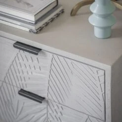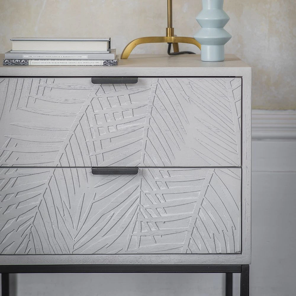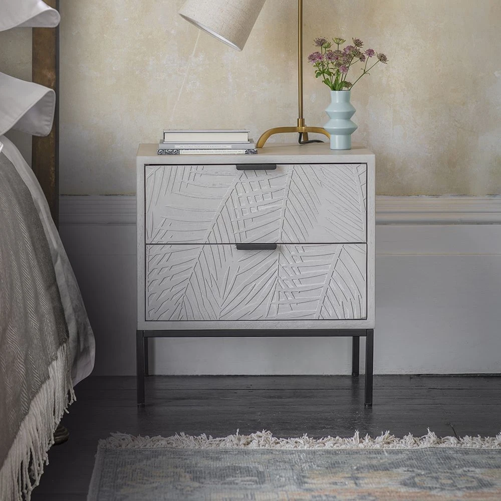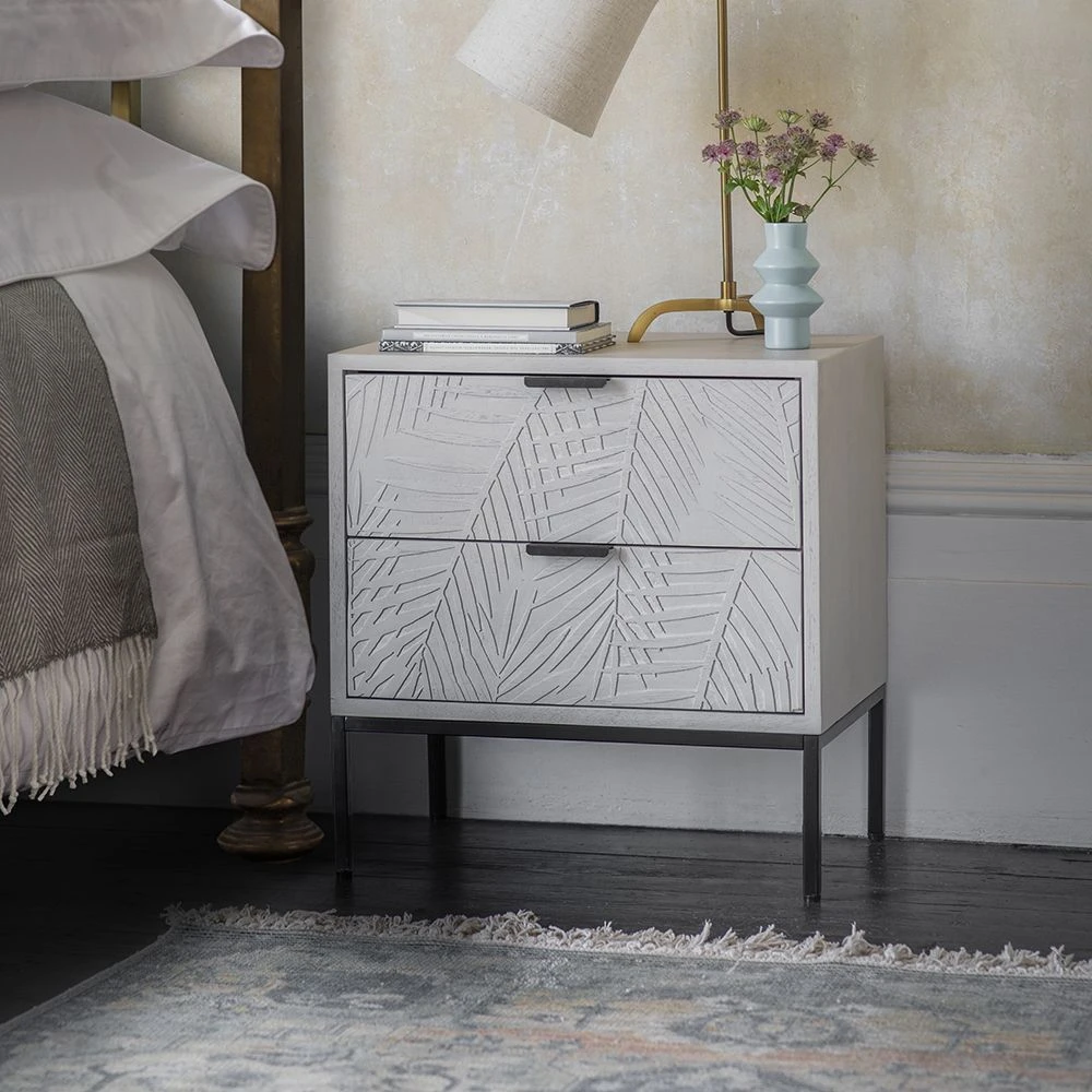 Our new Leaf Bedside Drawers are ideal for keeping a reading lamp and night-time essentials close to hand. In whitewashed mango wood with intricate leaf engraving and contrasting black metal powder coated legs and handles, it looks great in the main bedroom with one either side of the bed, as well as in a guest room or smaller box room and comes with two drawers for plenty of space.