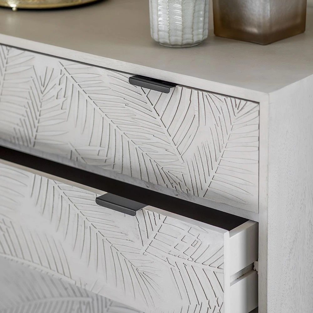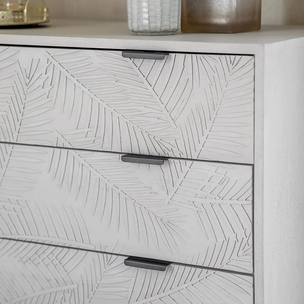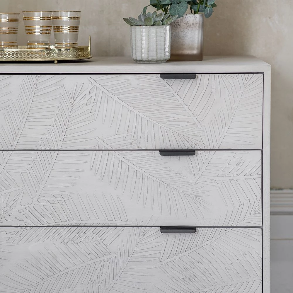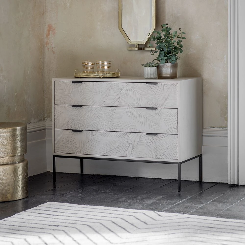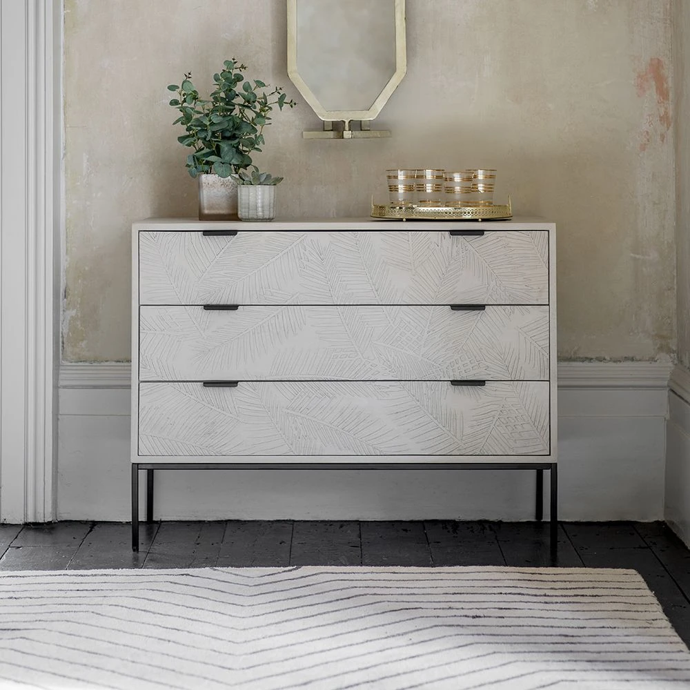 Offering extra storage space in the bedroom or guest room, our new Leaf Chest of Drawers has three spacious drawers for clothes and accessories. The whitewashed mango wood design has an intricate leaf engraving, contrasted with on-trend black metal powder coated legs and handles.