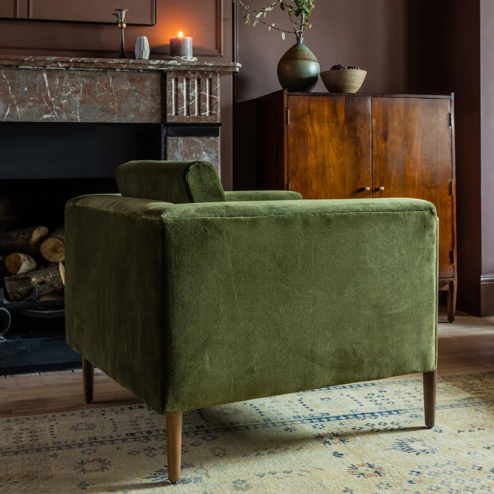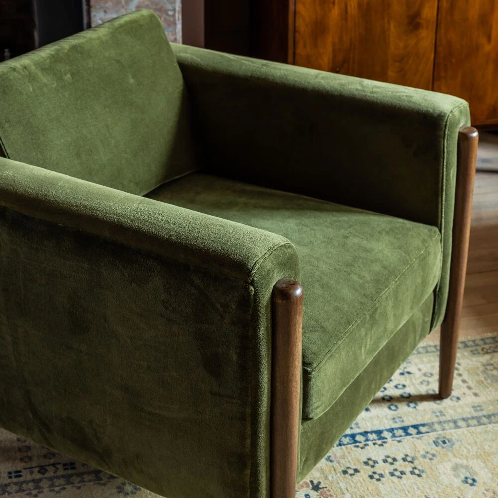 A geometric-style armchair perfect for all kinds of interiors, from classic to contemporary, industrial to retro and art-deco, our Lexington Armchair in Deep Green Velvet mixes a rich, deep green coloured cotton velvet seat, back and sides with vintage brown stained mango wood legs.