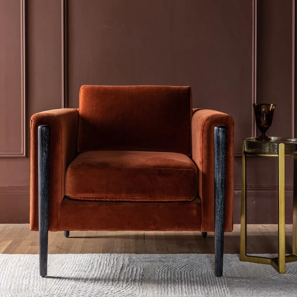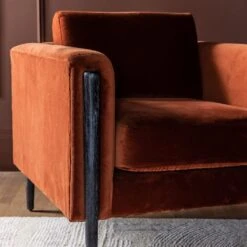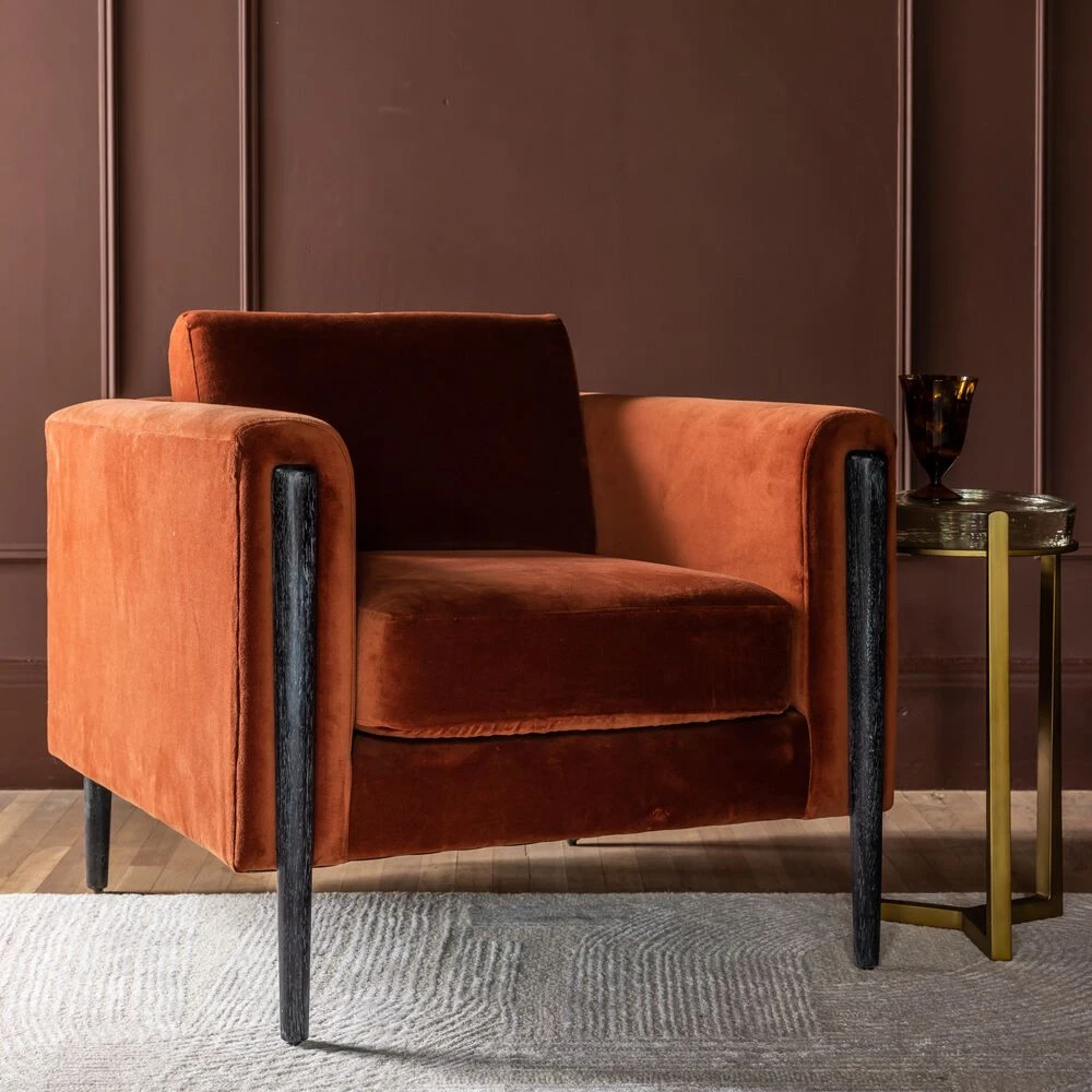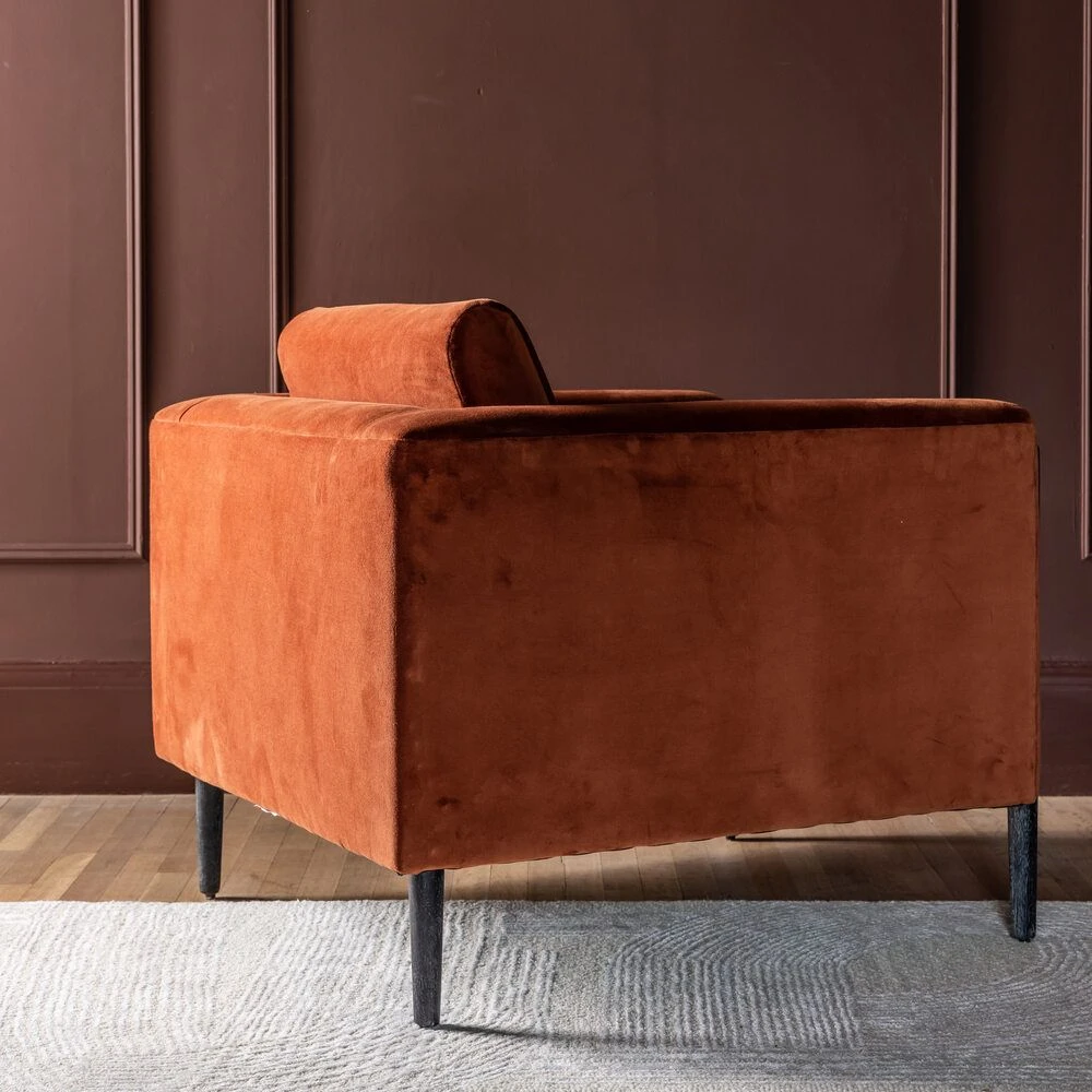 A geometric-style armchair perfect for all kinds of interiors, from classic to contemporary, industrial to retro and art-deco, our Lexington Armchair in Rust Velvet mixes a rich, vibrant rust coloured cotton velvet seat, back and sides with black stained mango wood legs.