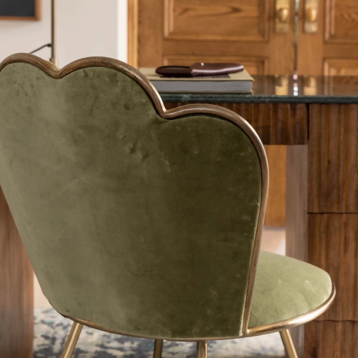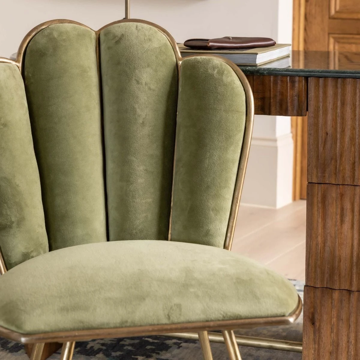 With its glamorous art deco styling, our Mara Occasional Chair in Green Velvet is a unique statement chair with a stunning scalloped upholstered back.