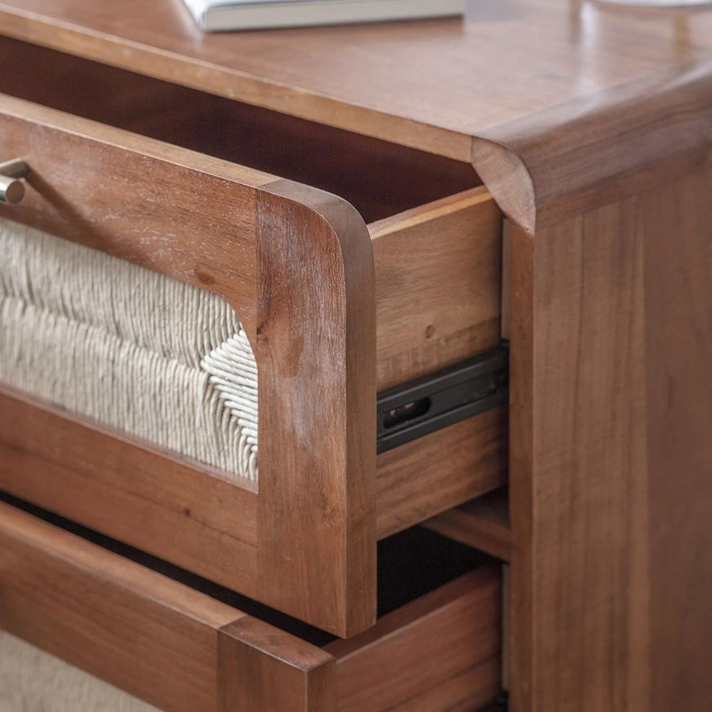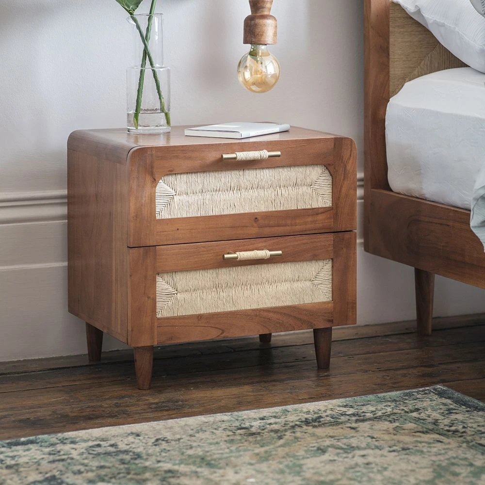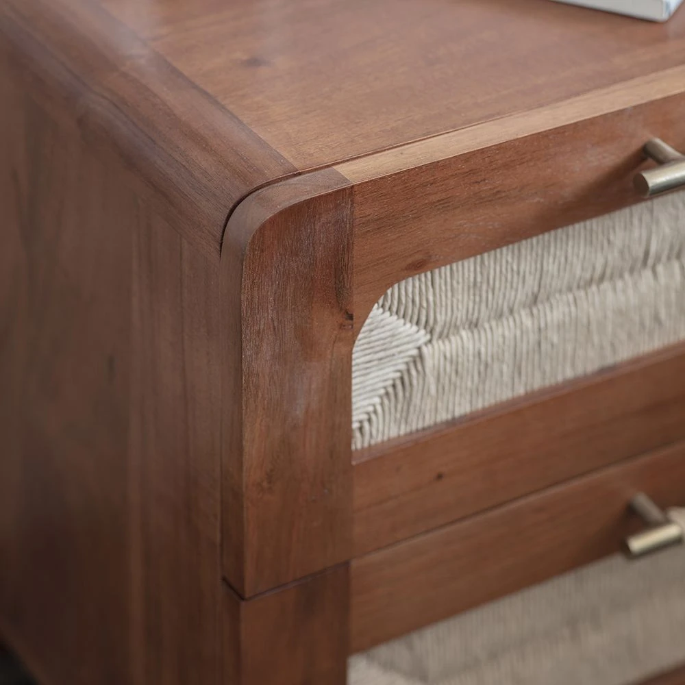 The Maya rattan style bedside table features two drawers for night-time essentials. The generous proportions of this cord woven bedside table feature distinct wrapped handle details to enhance the modern, minimalist bedside table style.