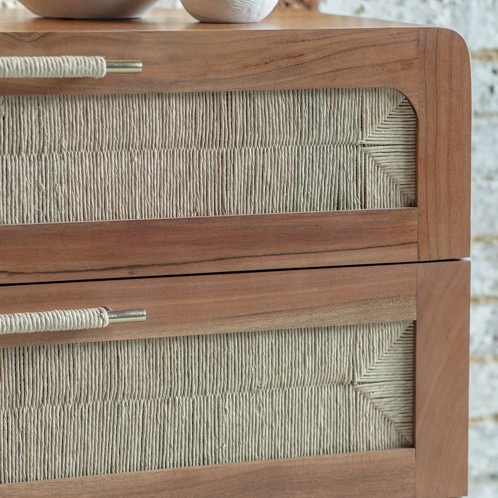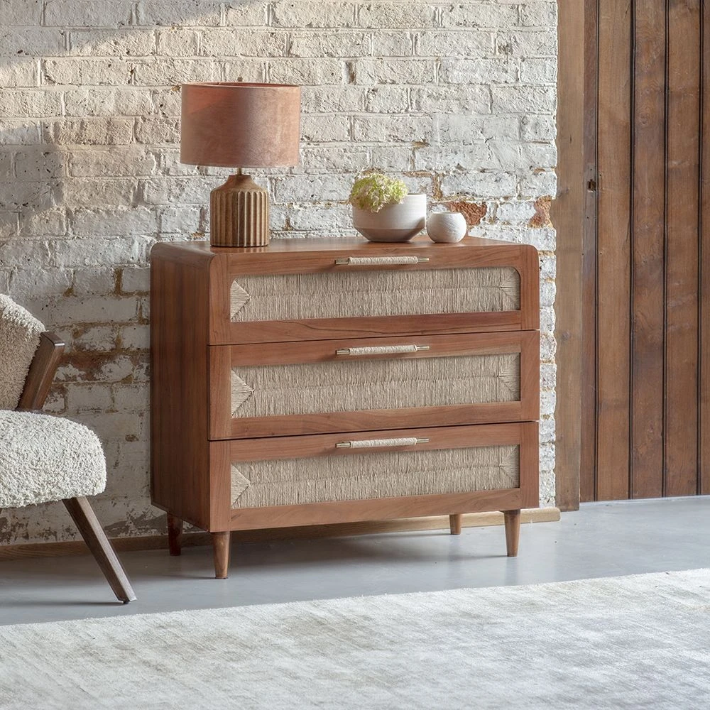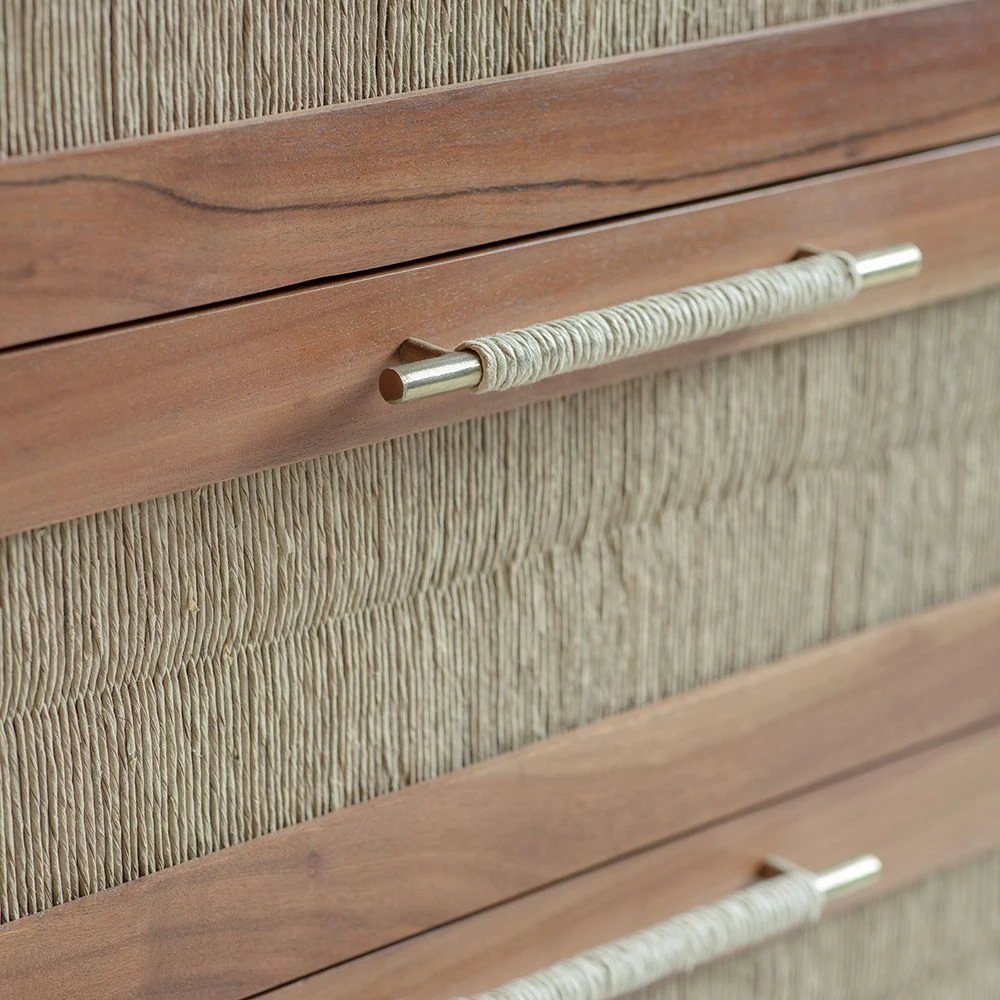 The Maya rattan style chest features three drawers for plenty of storage space. The generous proportions of this cord chest of drawers feature distinct wrapped handle details to enhance the modern, minimalist chest of drawers style.