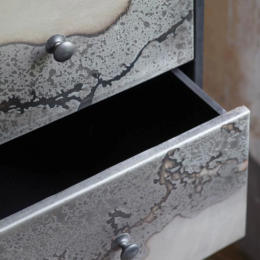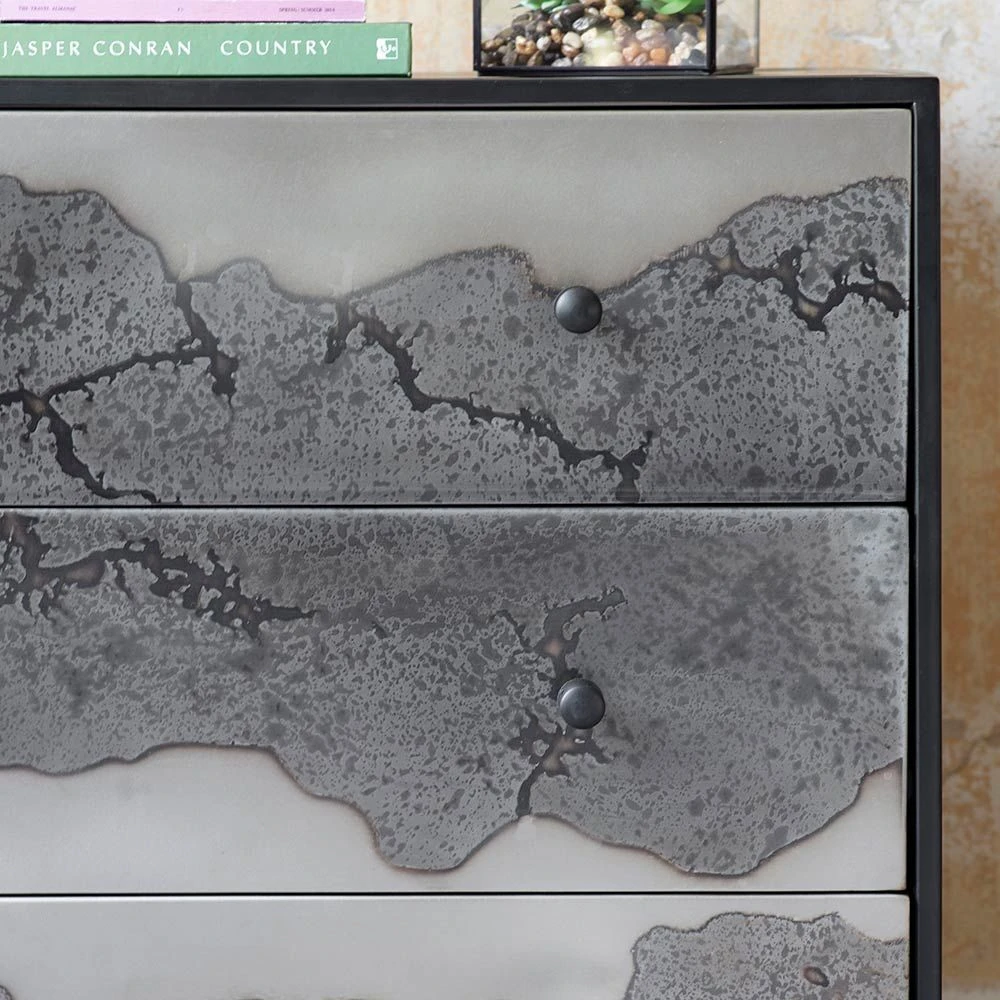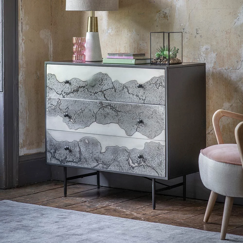 With its powder coated iron casing and legs, our new Mercury Chest of Drawers makes an instant impact in any bedroom. The intricate detailed finish on the drawer fronts is ideal for classic, contemporary or industrial interiors while the three ample-sized drawers provide plenty of storage for clothes and accessories. As well as the master bedroom, this chest is also great for teen’s rooms and guest bedrooms with a good surface area on top for a reading lamp, stack of books and other night-time essentials.