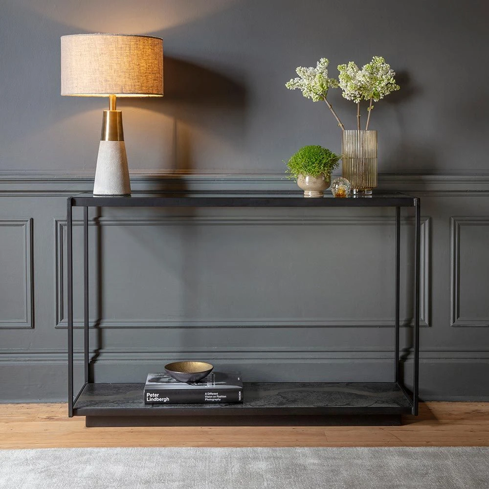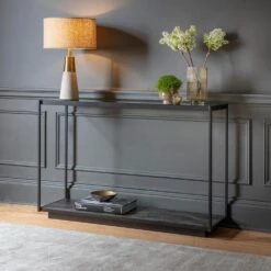 Putting the perfect finish to a living space, hallway or dining room, our Mercury Console Table combines the on-trend metallic look with a black frame finish. Its metal base is ideal for keeping books and magazines close to hand while the transparent glass top and open-ended design gives the illusion of added space.