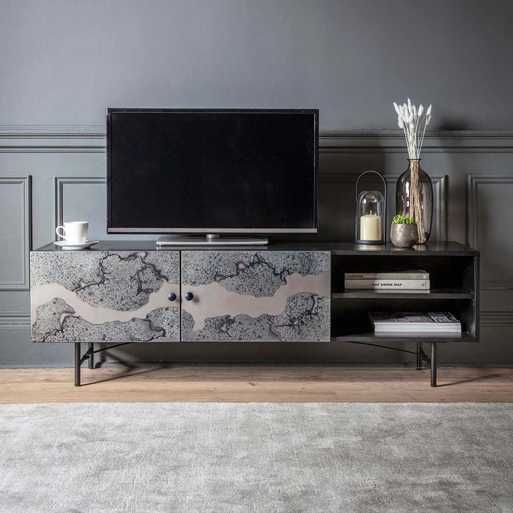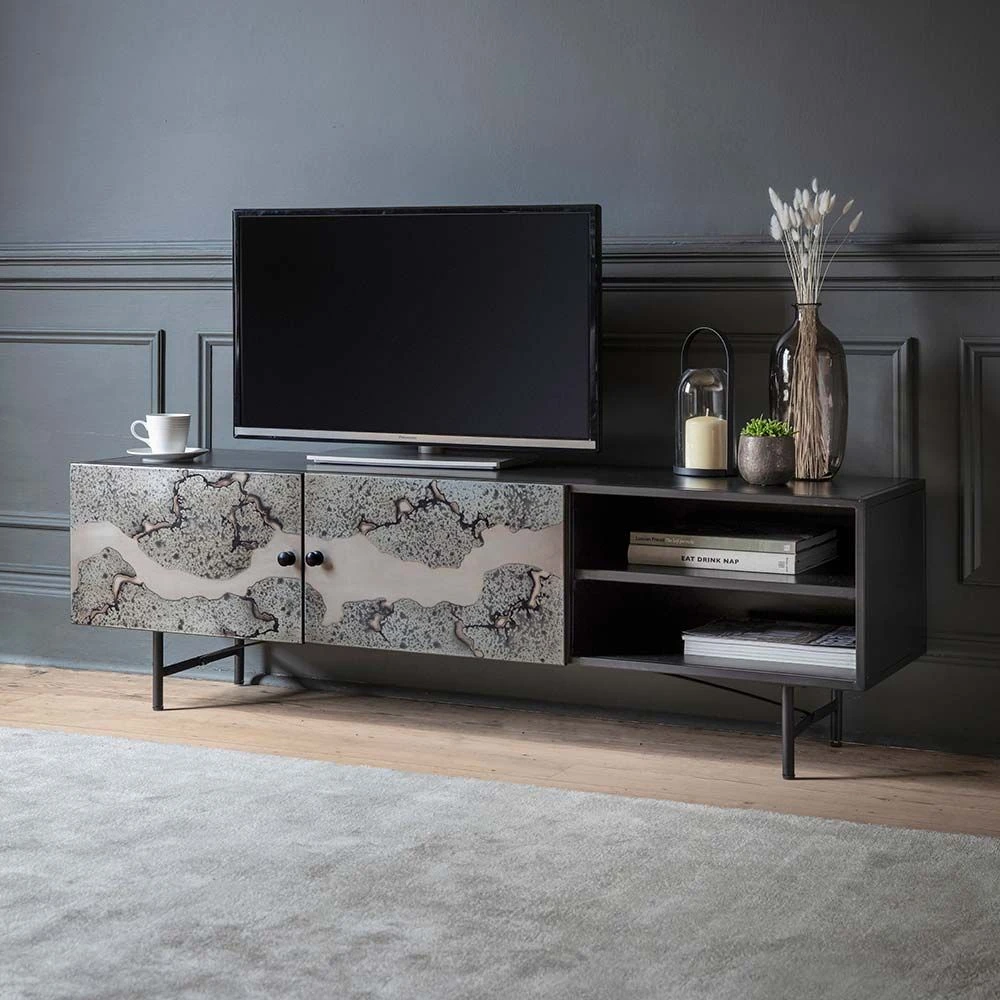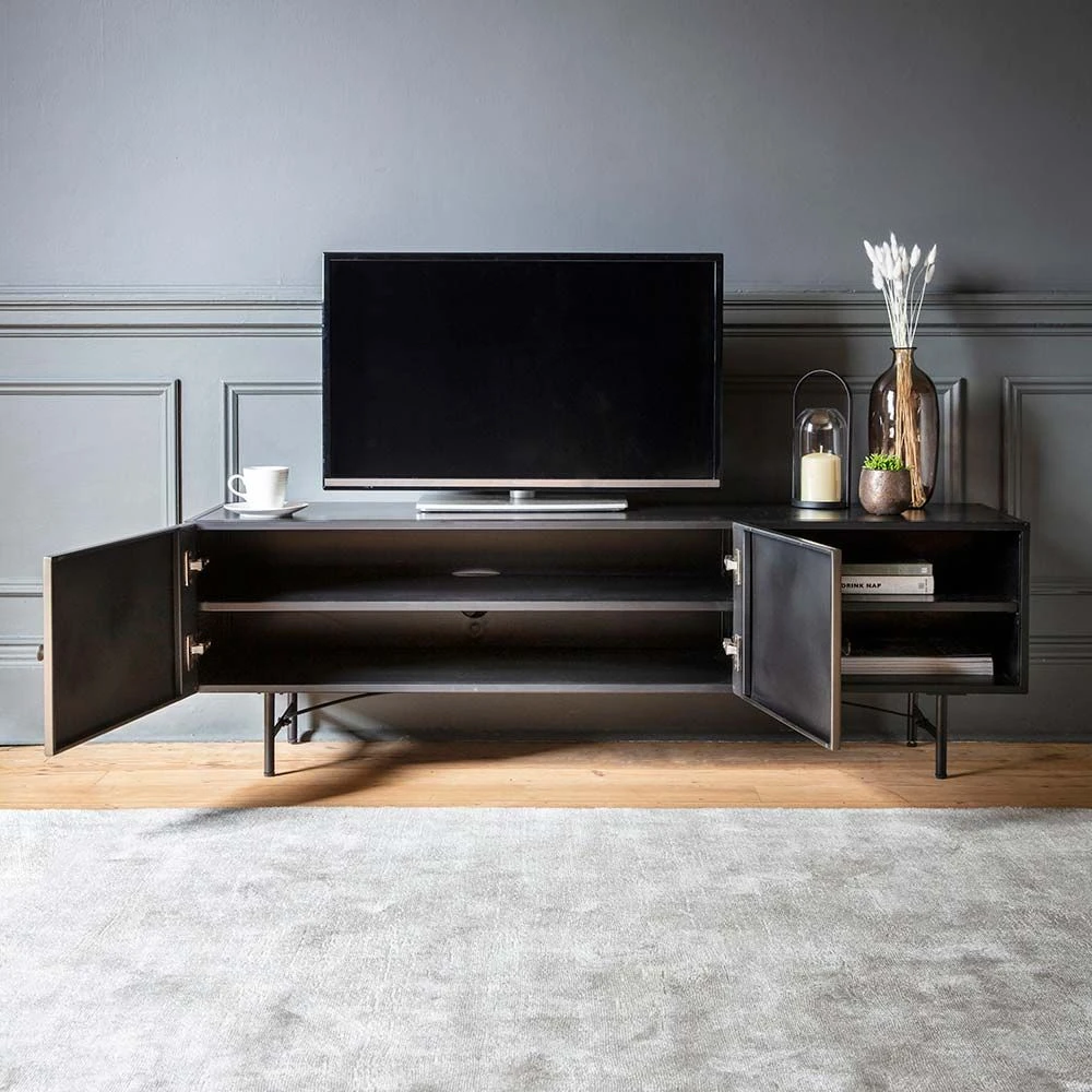 Create a stunning centrepiece in the living area or open-plan space with our Mercury Media Unit. It provides the perfect spot for the TV, games consoles and music system. Use the large surface area for the audio visual equipment and hide the games, DVDs, CDs, cables and leads in the combination of open and closed storage. The intricately detailed metal finish is perfect for industrial living schemes as well as ultra-modern and more classic décors.