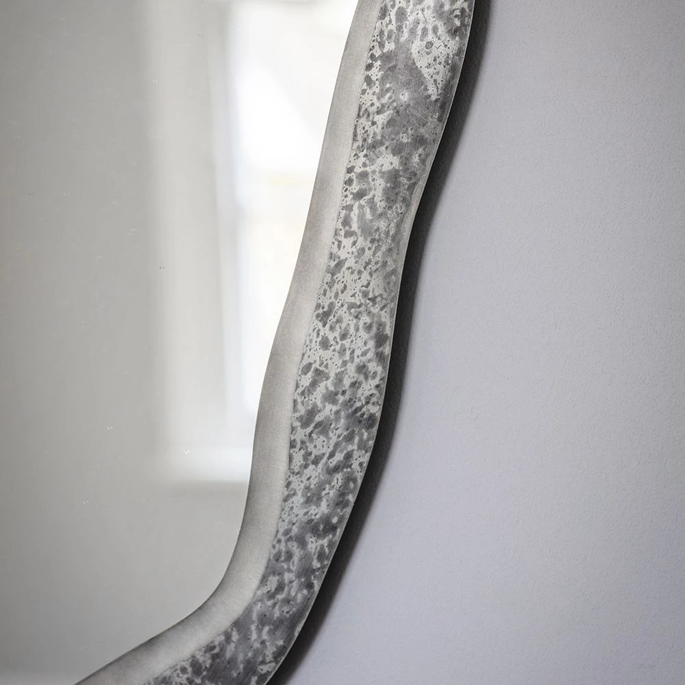 Add a focal point to your living space, dining area, hallway, or bedroom with our abstract shaped Mercury Mirror. This hand crafted iron mirror has a unique patina finish that catches the light and shimmers, making dark spaces feel lighter and brighter in an instant. The organic space is unusual and eye catching, making it as much a piece of art as it is a mirror.