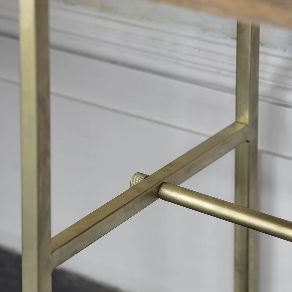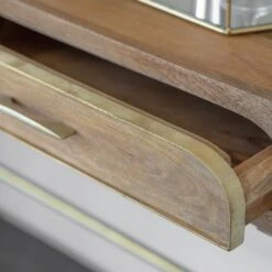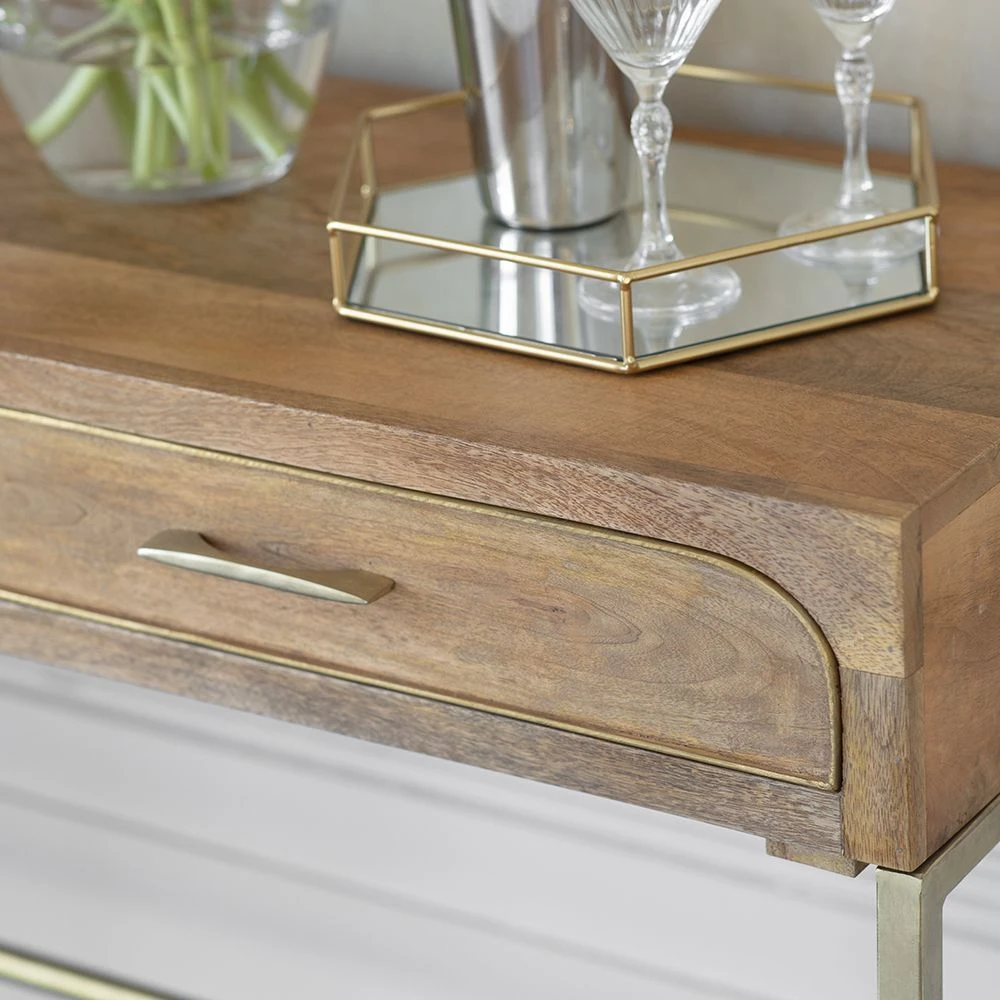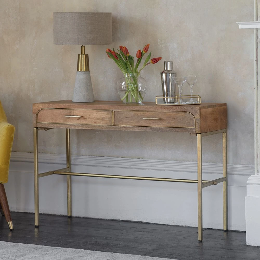 The Miro two drawer console is ideal as a dressing table, a desk for home working or a console in a narrow hallway. Perfectly proportioned, and with built in storage this is a practical table with an airy base that makes it perfect for smaller rooms as the brass metal base gives the illusion of more floor space.