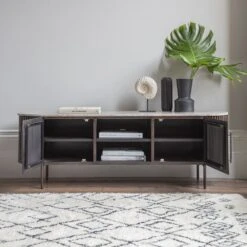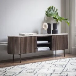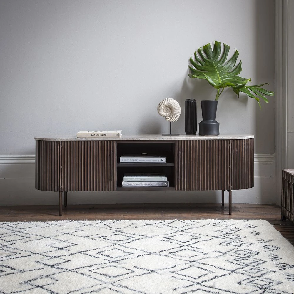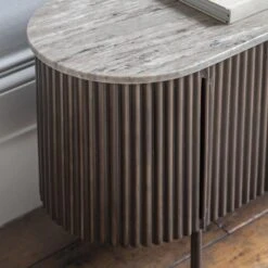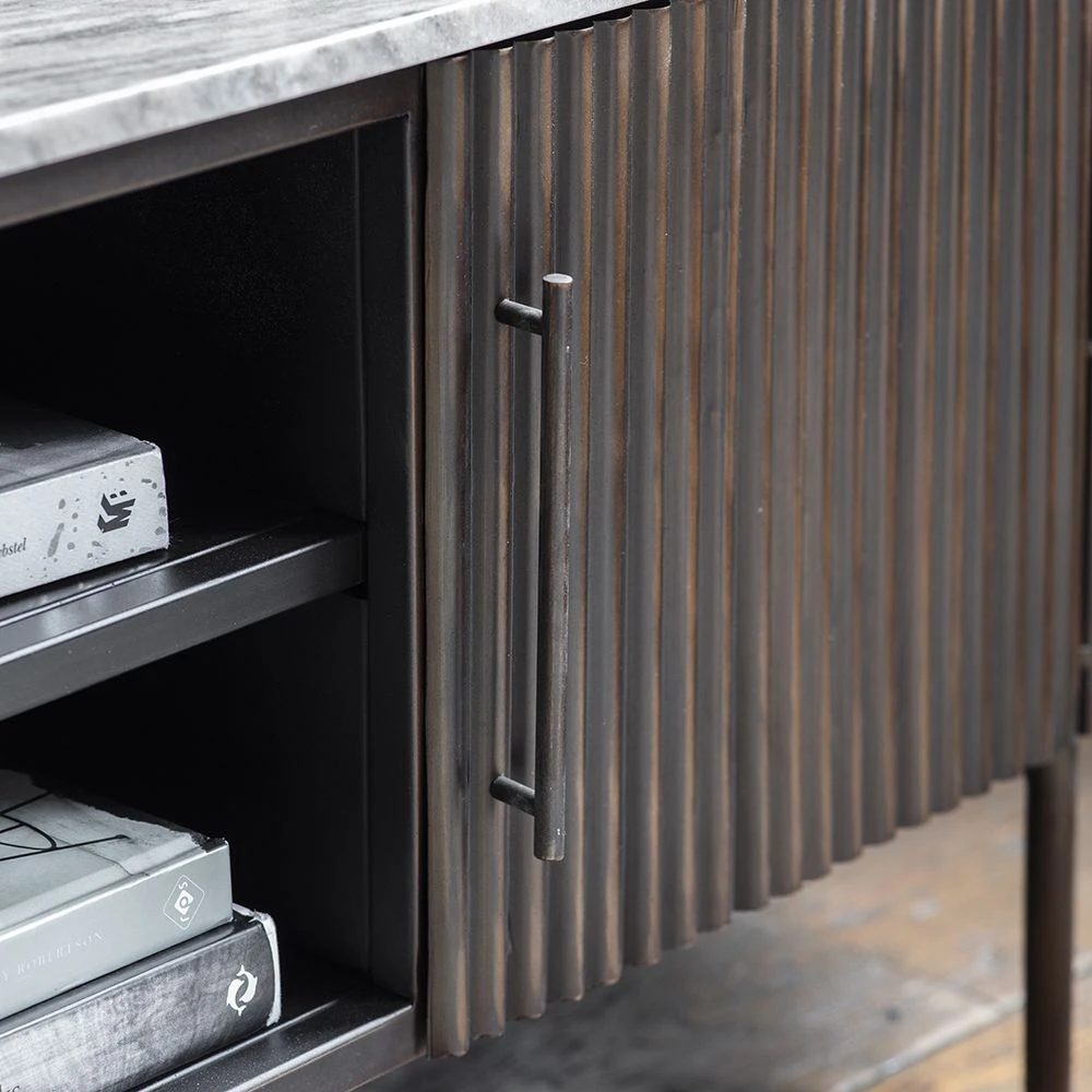 This marble top fluted metal media unit also comes with refined metal handles and thin legs to give it a modern twist.