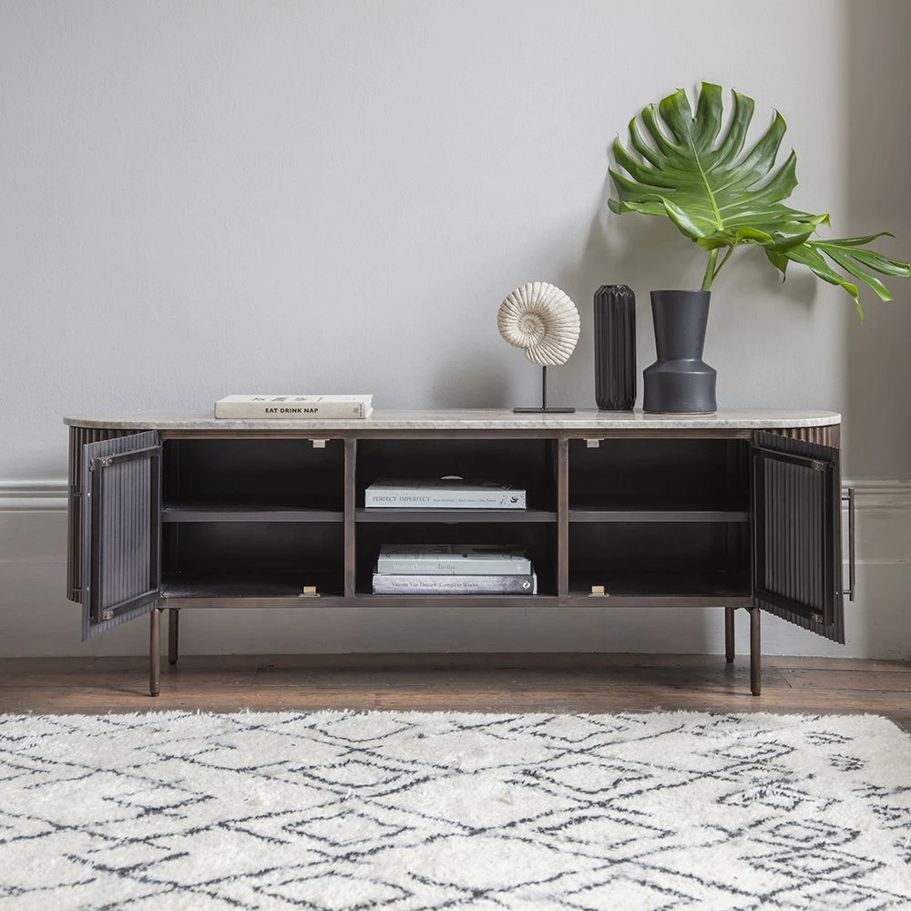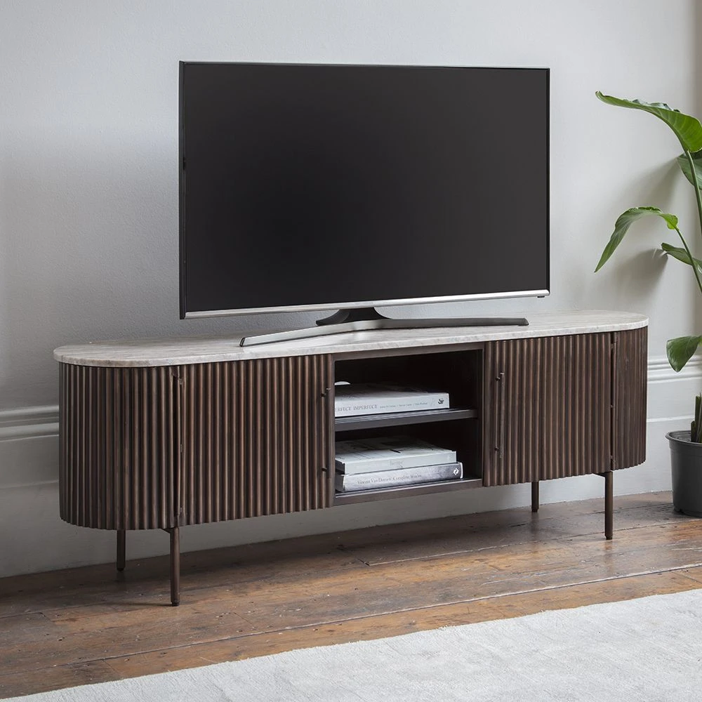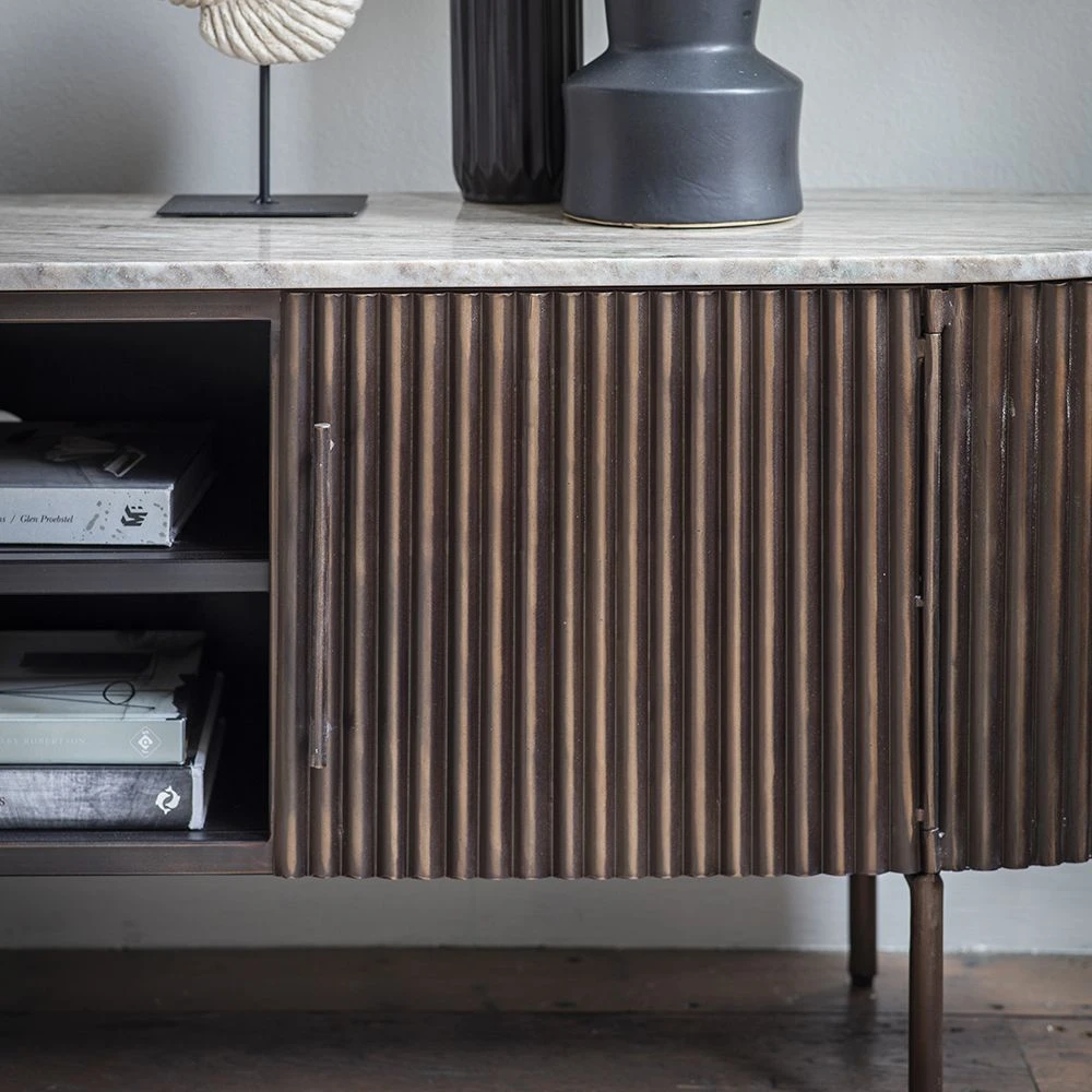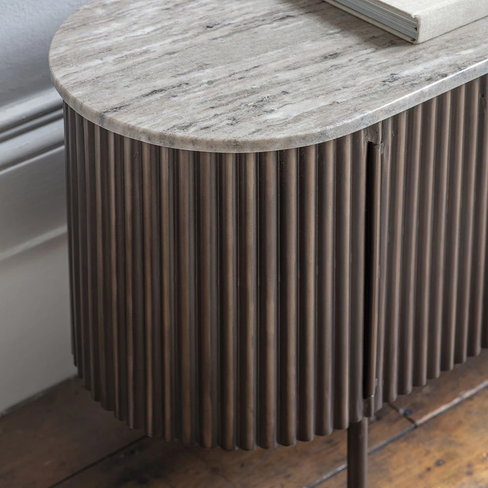 In an elegant antiqued bronze metal finish, the fluted design is perfectly in keeping with the trend for fluted furniture while the warm mocha marble top has neutral brown details running through it that gives it a retro contemporary look. Each piece of marble is unique so your media unit will be a one-off piece.