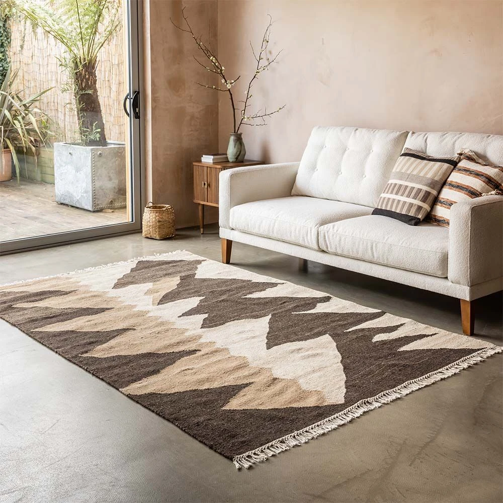 The Neelu Wool Flatweave Rug will add a design feature to floorboards, stone tiles or carpet.