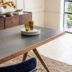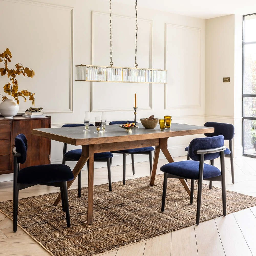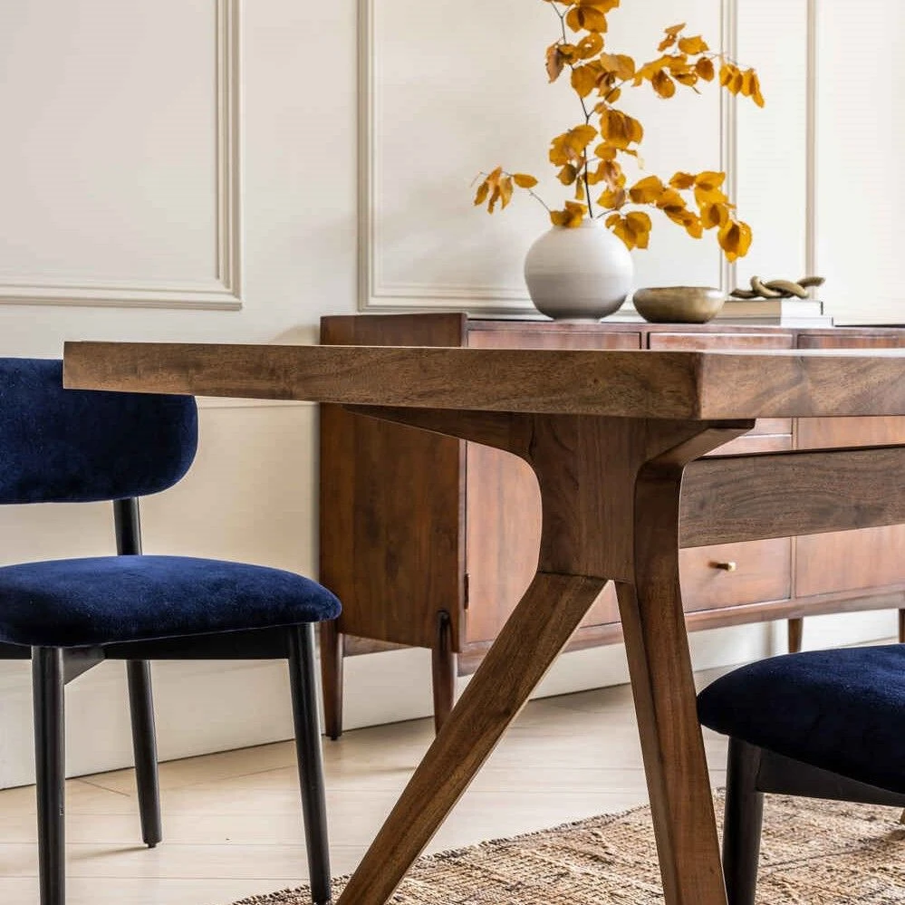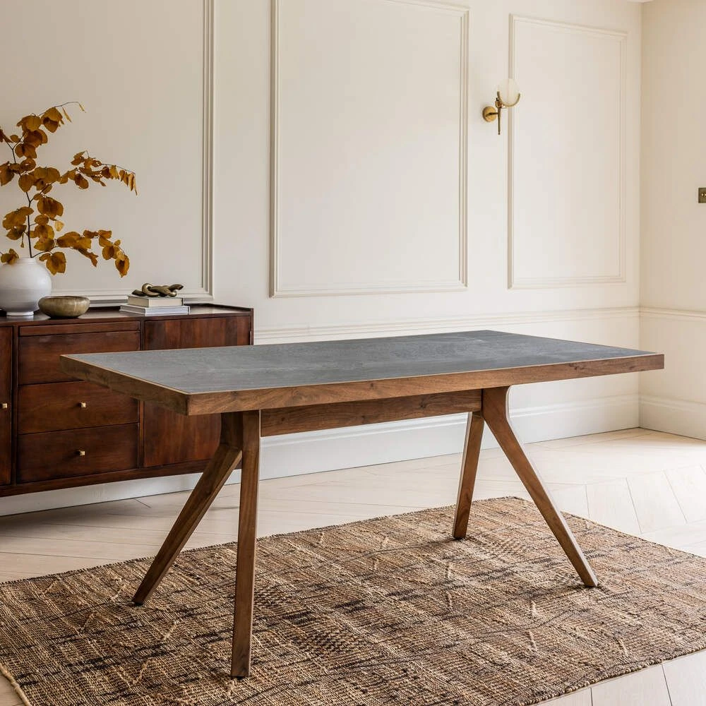 The table top is paired with a mid century base lovingly crafted from acacia wood in a dark stained finish, with splayed legs that make it easy to fit benches and dining chairs around the edge.